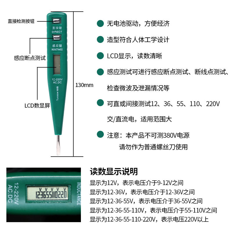 拓森0401电子感应测电笔是一款无需电池驱动的智能数显验电笔,采用先进的电磁感应技术,通过人体接地形成回路即可工作,安全便捷。其高清LCD数显屏可清晰显示电压数值,支持交流电压检测(通常90V-1000V),适用于家庭电路、插座、开关等日常用电检测。笔身设计符合人体工学,握感舒适,具备声光双重报警功能,提升操作安全性。同时具备零火线识别、断点检测等实用功能,是电工及家庭用户的理想工具。无需更换电池,环保节能,响应迅速,精度高,广泛应用于电器维修、装修检测等场景,是保障用电安全的得力助手。