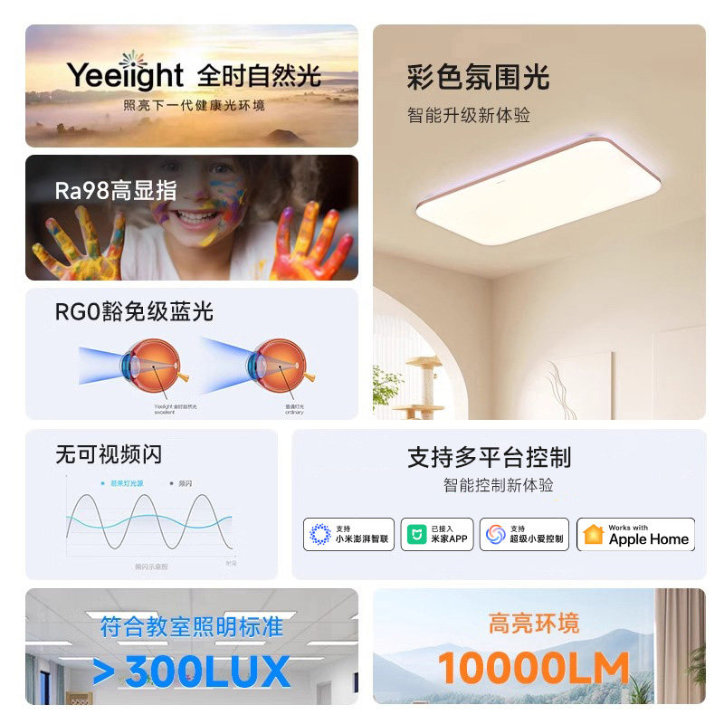 Yeelight智能电竞房吸顶灯融合简约现代设计与电竞氛围灯光,专为卧室、客厅等空间打造。灯体采用超薄设计,光线柔和均匀,支持米家APP智能控制,可远程调节亮度、色温,营造舒适阅读、温馨休息或激情电竞等多种场景模式。内置RGB炫彩灯带,一键切换炫酷光效,提升游戏沉浸感。支持小爱语音控制,操作便捷。高显色指数还原真实色彩,护眼更安心。无论是日常照明还是娱乐氛围,Yeelight智能电竞吸顶灯都能轻松驾驭,让家居空间更具科技与美感,点亮智慧生活新体验。