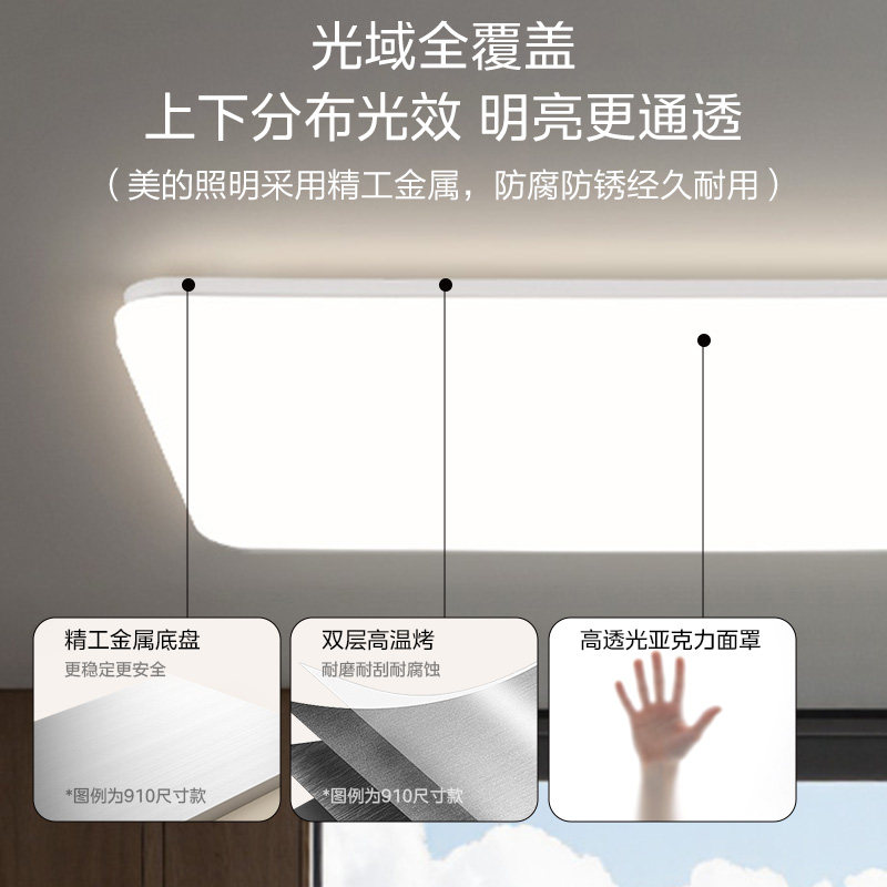 美的客厅灯LED全光谱吸顶灯,采用先进全光谱技术,光线接近自然光,显色真实、护眼舒适,有效缓解视觉疲劳。现代简约设计,线条流畅,适配多种家居风格,适用于客厅、卧室等空间。支持智能控制,可通过手机APP、语音助手(如小美音响、天猫精灵等)远程调节亮度与色温,营造温馨、明亮或静谧氛围。高透光面罩搭配优质LED光源,节能环保、寿命长久。全屋智能灯具套餐涵盖多房间配置,一键联动,打造智慧家居照明系统,提升生活品质与便捷体验。美的品质保障,安装简便,是追求健康照明与智能生活的理想选择。