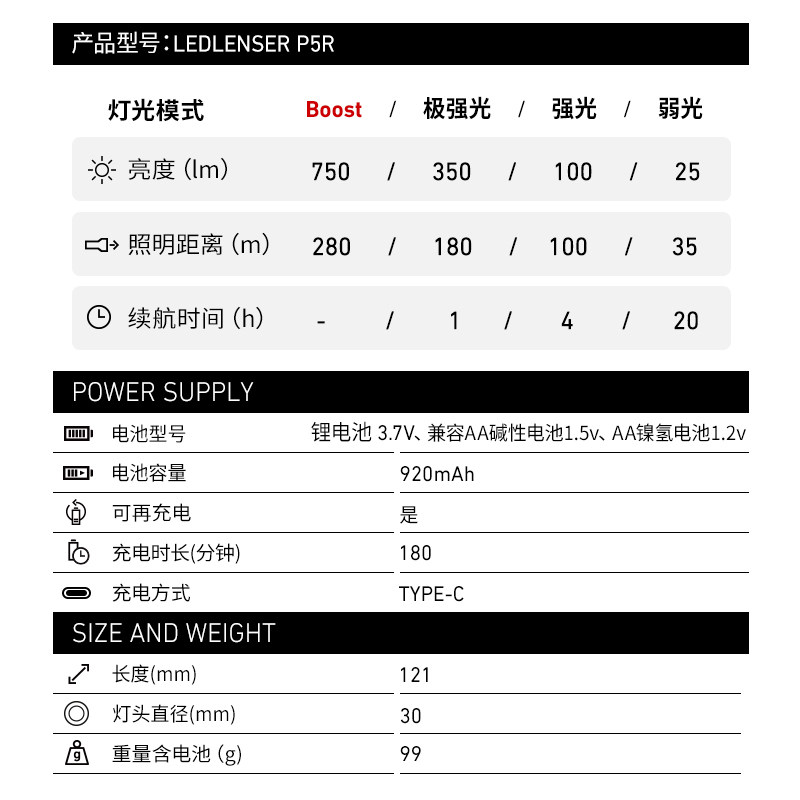 德国莱德雷神P5R手电筒是一款集强光、变焦与便携于一体的优质双电源手电。采用高品质LED灯珠,最高亮度可达1000流明,射程远、光斑均匀,支持多档调光及远近光变焦切换,适应不同照明需求。机身小巧轻便,铝合金材质坚固耐用,具备IPX8级防水性能,户外使用更安心。支持Type-C快充,内置可充电锂电池,同时兼容CR123A电池,双电源设计确保续航无忧。无论是夜间徒步、露营探险,还是日常应急,P5R都以卓越性能与德国精工品质,成为值得信赖的随身照明利器。