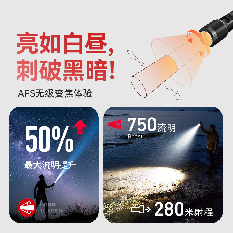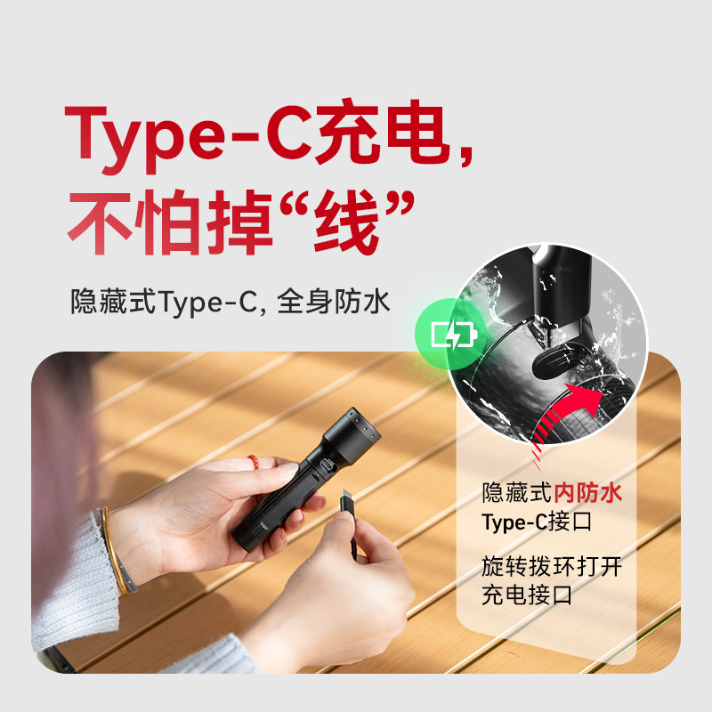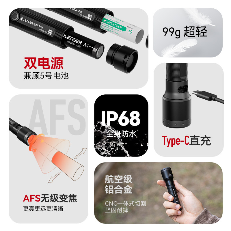 天猫双电源手电|德国莱德雷神P5R 手电筒强光变焦小型便携Type-C充电