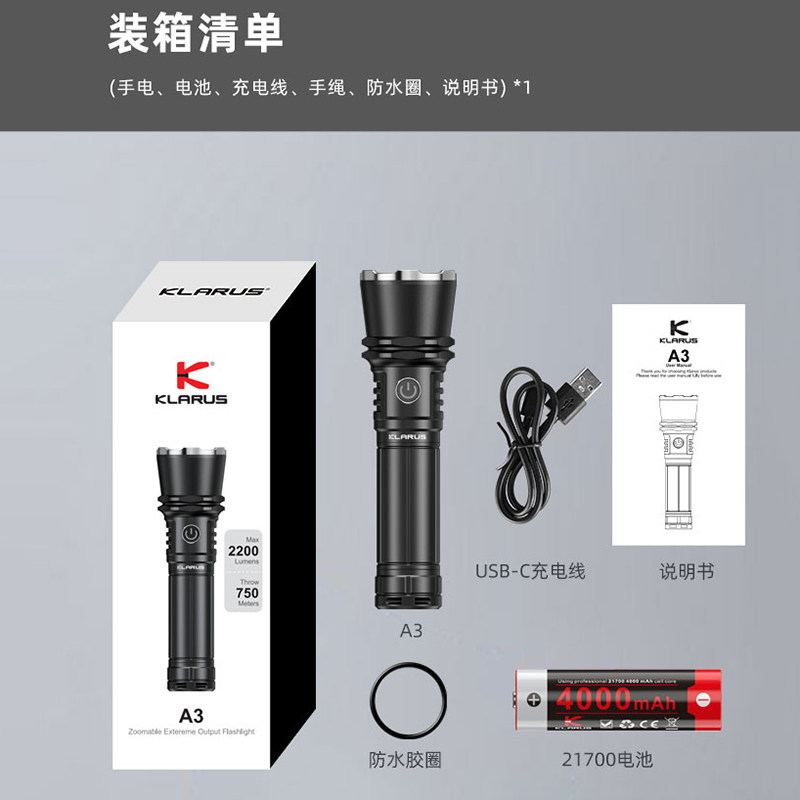 淘宝KLARUS凯瑞兹A3可调焦手电筒可充电 远射超亮聚光家用强光