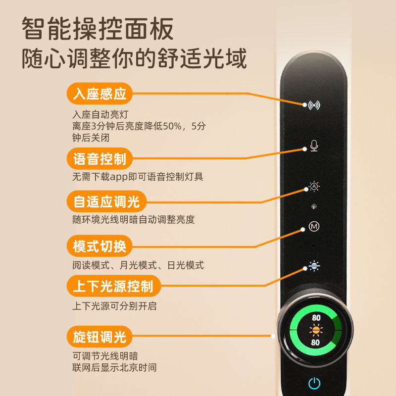 老爸评测智能款落地大路灯专为儿童阅读学习设计,采用全光谱光源,高度还原自然光,有效减少蓝光危害,提供均匀柔和的照明,降低用眼疲劳。灯体高度可调,覆盖范围广,适合书桌、沙发或阅读角等多种场景。智能感光功能可根据环境光线自动调节亮度,支持多档色温与亮度手动调节,满足不同学习需求。通过权威护眼认证,无频闪、无眩光,守护孩子视力健康。简约现代设计,稳固底座防倾倒,安全耐用。老爸评测严选品质,让家长更放心,是孩子自主学习、健康成长的理想照明伙伴。