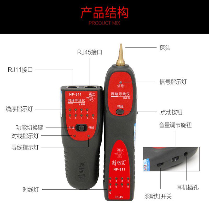 精明鼠NF-811是一款集寻线、测线、查线于一体的多功能网络测试仪,适用于网线、电话线、同轴电缆等多种线路的故障排查与识别。其发射端可发出高频信号,配合高灵敏度探头,能在嘈杂环境中快速定位目标线缆,广泛应用于网络布线、安防监控及通信维护等领域。设备具备通断测试、线序检测、短路识别等功能,操作简便,响应迅速。NF-811采用便携式设计,LED状态指示清晰,续航持久,是工程人员、网络工程师及维修技师的理想工具,显著提升线路排查效率,保障网络系统的稳定运行。