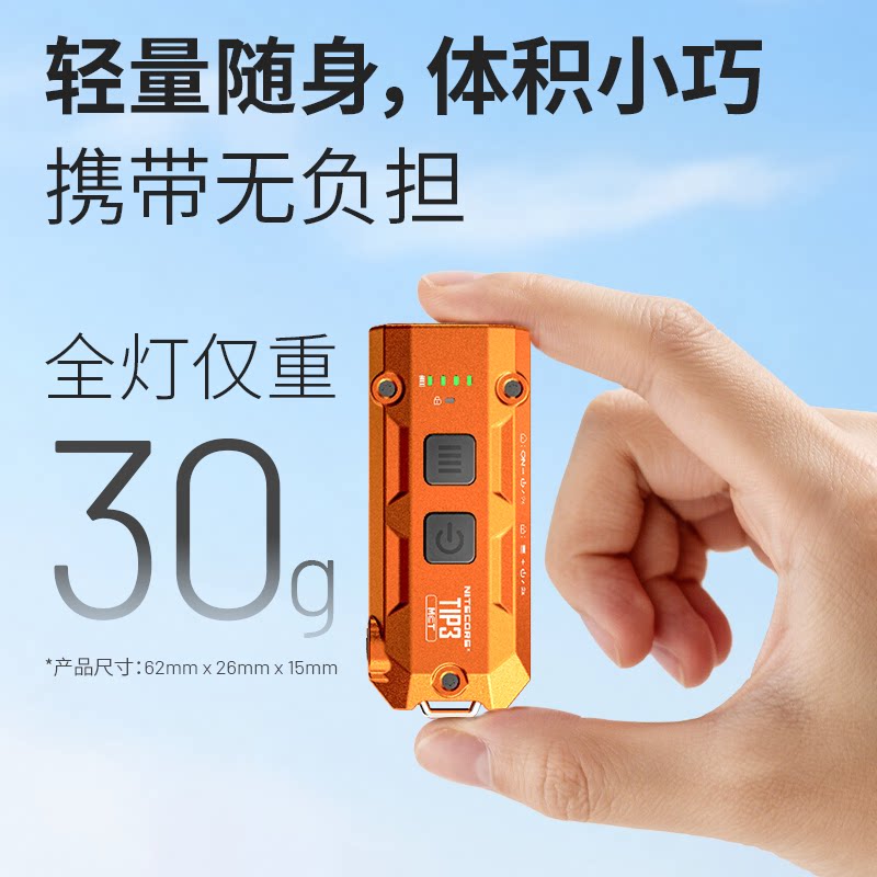 【2026新品】NITECORE奈特科尔Tip3钥匙扣灯,重新定义EDC随身照明体验。这款迷你手电筒仅重约25克,轻巧便携,可轻松挂于钥匙圈或背包,随时应对暗光环境。采用高亮OSRAM P8 LED,最高输出达1000流明,远射距离达150米,三档亮度+爆闪模式,满足不同场景需求。内置500mAh可充电锂电池,支持USB-C直充,续航长达10天(低亮模式)。IP68防水防尘,坚固耐用。新增智能温控与电量提示功能,安全更省心。Tip3集性能、便携与科技于一身,是户外探险、日常通勤与应急照明的理想之选。