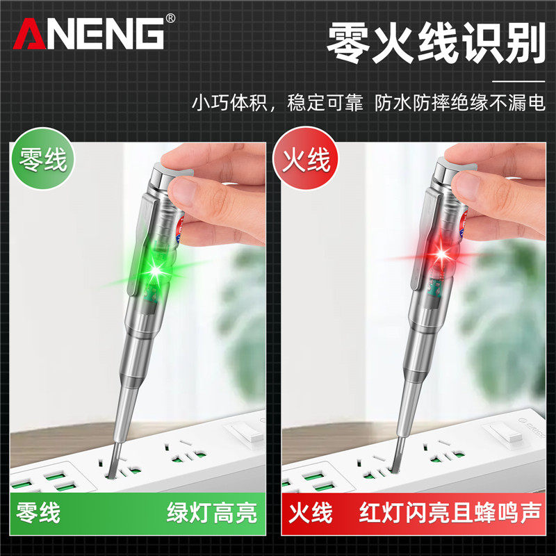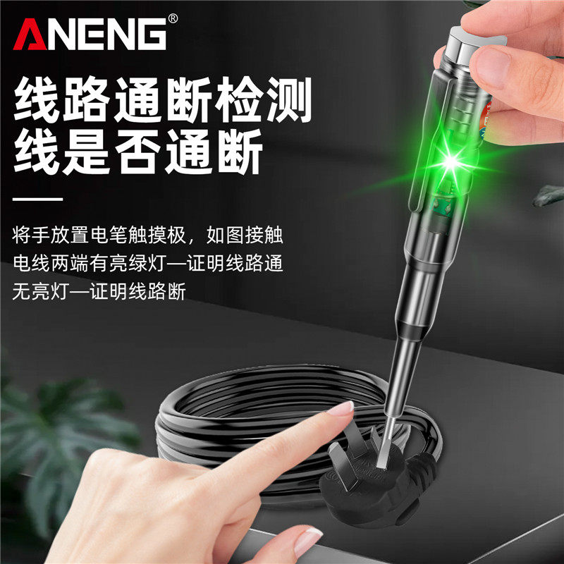 感应电笔电工专用高精度多功能查断点零火线路检测声光警报测电笔,专为电工日常检修设计,具备非接触式感应检测功能,可精准识别火线、零线及断点位置。采用高灵敏度探头,响应迅速,支持声光双重报警,即使在嘈杂环境中也能清晰提示。笔身符合人体工学设计,绝缘防护等级高,使用安全放心。适用于家庭电路、配电箱、插座线路等多种场景,是排查线路故障、保障用电安全的得力工具。高精度、多功能、操作简便,深受专业电工信赖。