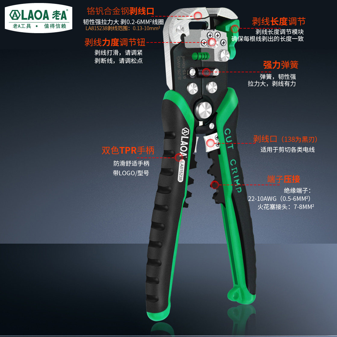 老A多功能剥线钳是一款集剥线、剪线、压线、断线于一体的全自动弹簧剥线钳,专为电工、电子维修及通信工程人员设计。采用高强度合金钢材质,刀刃锋利耐用,可轻松处理不同规格的电线、电缆。内置自动弹簧回弹装置,操作省力高效,单手即可完成快速剥皮,精准控制剥线深度,避免损伤导体。配备多档位调节,适配0.2–6mm²线径,兼容单芯、多芯线及同轴电缆。人体工学防滑手柄,握感舒适,长时间使用不易疲劳。结构紧凑,便携实用,是家庭、工地和维修车间不可或缺的专业工具,显著提升作业效率与安全性。