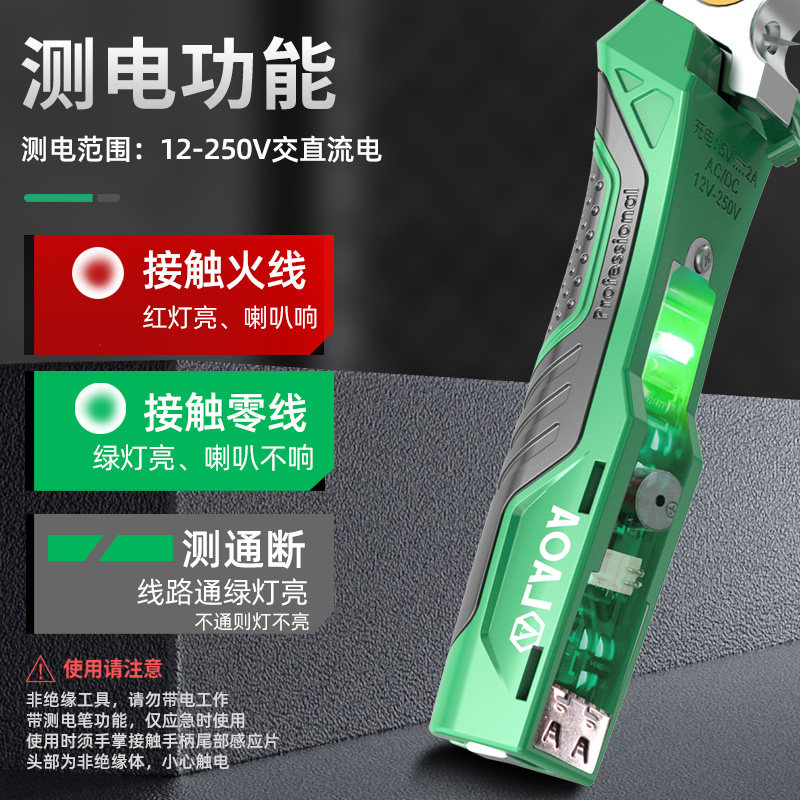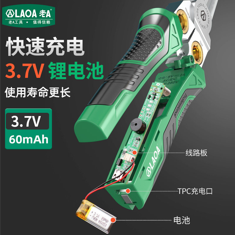 老A剥线钳8合1电工钳是一款集多功能于一体的便携式电工工具,专为现代电工和DIY爱好者设计。它集成剥线、压接、剪切、拔线、分线、测电等多种功能,满足日常布线、维修等多样化需求。配备3.7V可充电锂电池,无需外接电源,操作灵活便捷。内置智能测电功能,可快速检测线路通断与电压,提升作业安全性。人体工学设计手柄,防滑耐磨,长时间使用不疲劳。结构紧凑,携带方便,适用于家庭、工程、通信等多种场景。老A8合1电工钳以高效、安全、耐用为核心,是电工工具箱中的理想之选,显著提升工作效率与操作体验。