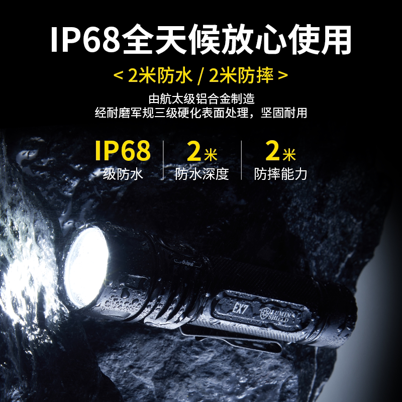 NITECORE奈特科尔EX7是一款专为户外探险设计的高性能强光手电筒,搭载21700大容量锂电池,最大亮度高达4200流明,照射距离远达520米,满足夜间徒步、露营、搜救等严苛环境需求。采用航空级铝合金材质,坚固耐用且具备IP68级防水防尘性能。EX7支持多档亮度调节、爆闪及SOS模式,配备智能温控与电量显示功能,使用安全便捷。尾部磁吸设计可吸附金属表面,解放双手,提升操作灵活性。官方正品保障,品质可靠,是户外爱好者和专业用户的理想照明伙伴。无论是极端天气还是复杂地形,EX7都能提供稳定、明亮的照明支持。