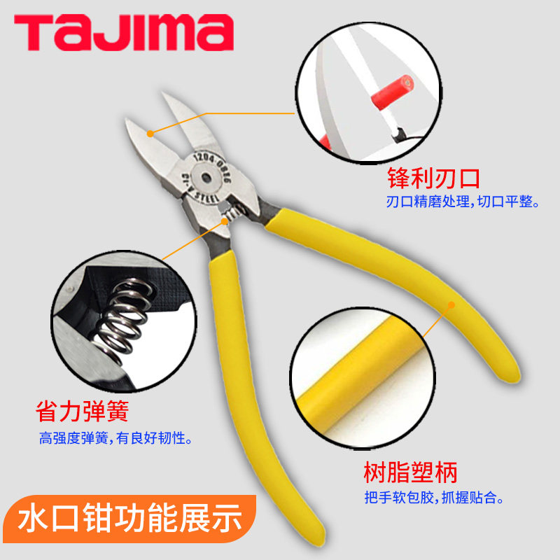 田岛水口钳是一款专为电工及精密作业设计的高品质斜口剪钳,采用工业级超硬合金钢材质,经特殊热处理工艺打造,具备卓越的硬度与耐磨性,可轻松剪切各类电线、铜丝、铝线及细小金属件。其精密研磨的斜嘴设计,确保剪切面平整无毛刺,操作省力且精准。符合人体工学的防滑手柄,提供舒适握感与稳定控制,适用于长时间作业。广泛应用于电子维修、配电安装、模型制作等领域,是专业电工和 technicians 的得力工具。田岛品牌以耐用性与可靠性著称,此款水口钳兼顾强度与精细度,是工业级剪线作业的理想选择。