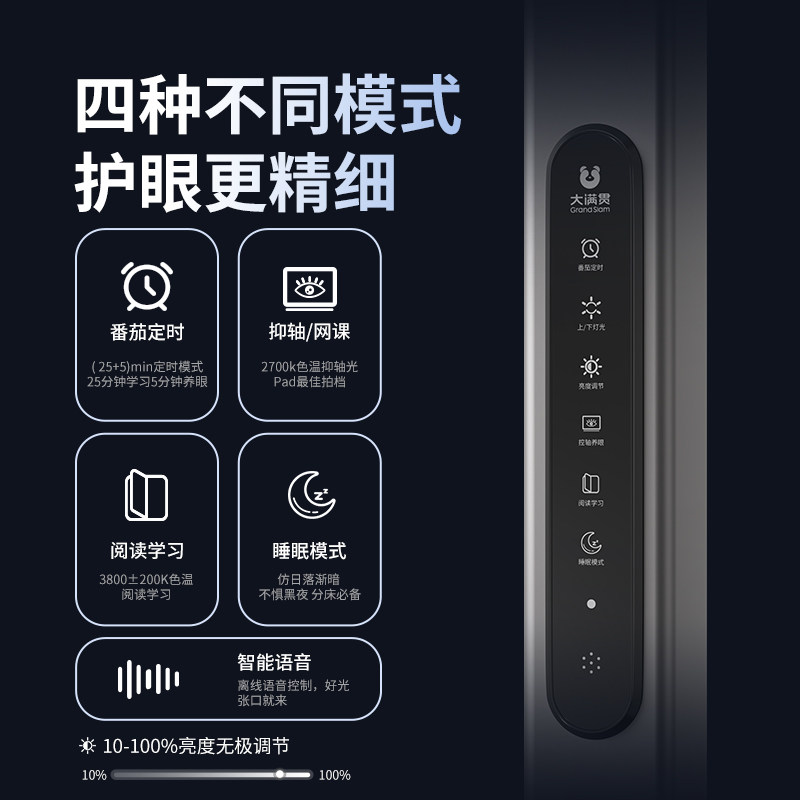 大满贯护眼大路灯D1是一款专为儿童学习设计的全光谱落地护眼灯,采用先进的全光谱LED技术,模拟自然晨光,显色指数高达Ra98,有效还原真实色彩,减少视觉疲劳。其独特的大面积发光面设计,提供均匀柔和的照明环境,避免阴影与频闪,呵护孩子视力健康。D1特别注重控眼轴发展,通过科学的光照调节,帮助延缓近视发生。灯体高度可调,适配不同学习场景,配备智能感光与定时休息提醒功能,培养孩子良好用眼习惯。底座稳固,安全可靠,是守护儿童视力、提升学习效率的理想之选。