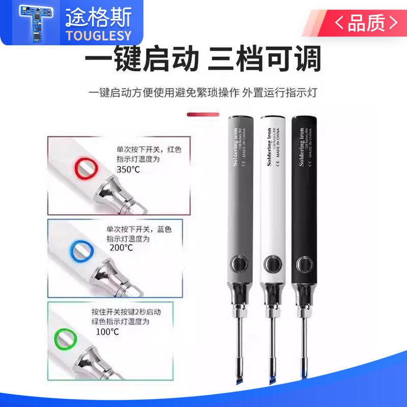 这款USB充电式无线电烙铁笔,是一款迷你便携的家用焊接神器,集轻便、安全与高效于一体。采用先进的陶瓷发热技术,升温迅速,控温精准,适用于焊锡、电子维修、DIY手工等多种场景。内置锂电池,支持USB充电,摆脱电源线束缚,随时随地轻松使用。小巧笔形设计,握感舒适,操作灵活,特别适合精细作业。配备多种烙铁头,满足不同需求,同时具备过热保护和自动休眠功能,使用更安全。无论是家庭维修、数码爱好者,还是烫烟码等创意应用,都是理想之选。静音低耗,环保节能,是现代生活与手工创作的得力助手。
