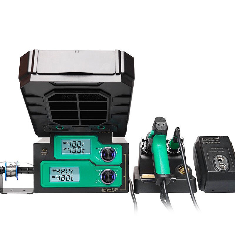 宝工SS-988H焊台是一款工业级6合1多功能拆焊设备,集可调温电烙铁、大功率吸锡器、热风枪、焊台支架、温度显示及安全防护于一体,适用于电子维修、PCB板焊接与拆焊等精密作业。其采用高效陶瓷发热芯,升温快、控温精准(200℃–480℃可调),功率高达60W,确保稳定输出。吸锡器配备强力真空泵,可快速清除焊点,提升拆焊效率。人体工学设计手柄,操作舒适,搭配耐高温硅胶线,安全可靠。SS-988H结构紧凑、功能全面,是电子工程师、维修技术人员及爱好者的理想工具,兼顾专业性与实用性,满足多种复杂焊接需求。