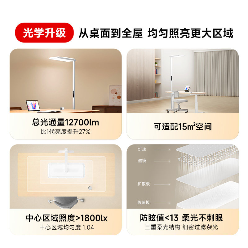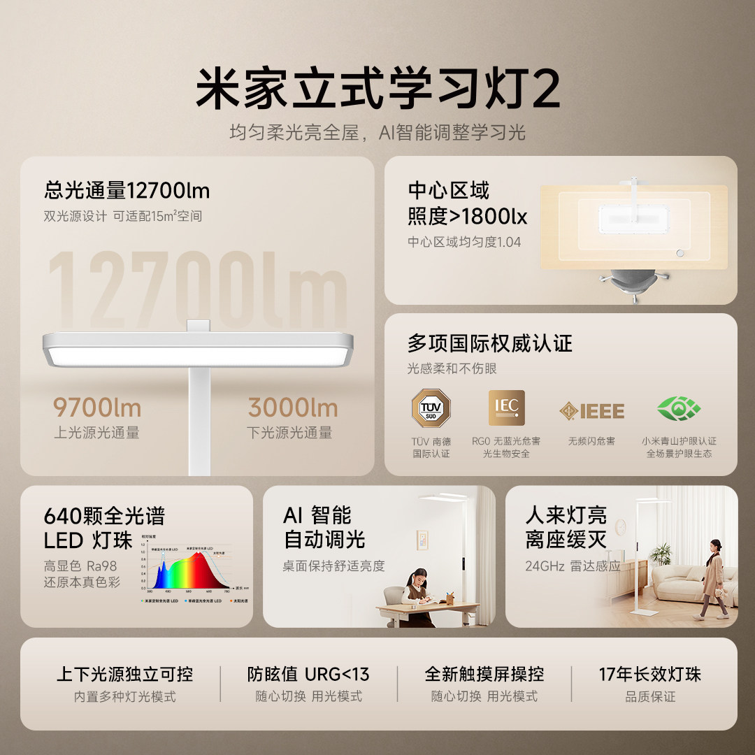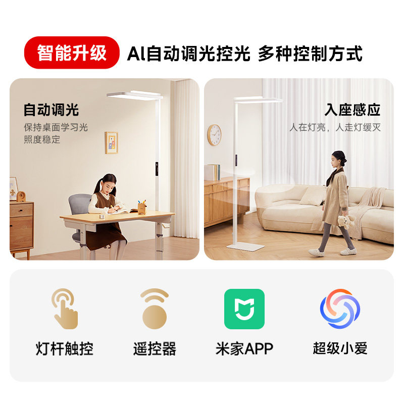 【新品】米家立式学习灯2大路灯,专为护眼学习设计,融合科学光学与智能科技。采用全光谱LED光源,模拟自然光,显色指数高达Ra95,有效减少蓝光危害,缓解用眼疲劳。灯头支持多角度调节,光线均匀覆盖1.2米大范围,告别暗区与重影。内置智能感光系统,自动调节亮度与色温,营造舒适学习环境。通过国家AA级照度认证,无频闪、低眩光,守护孩子视力健康。简约立式设计,节省桌面空间,适配书桌、客厅等多种场景。米家APP智能控制,定时休息提醒,助力高效学习。让专注更持久,让成长更明亮。