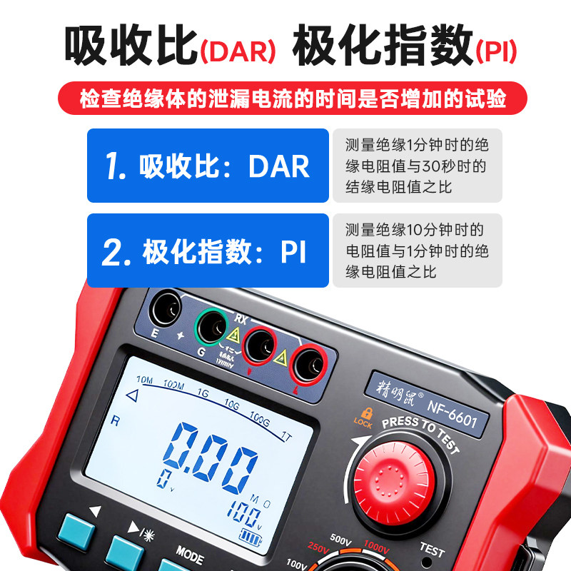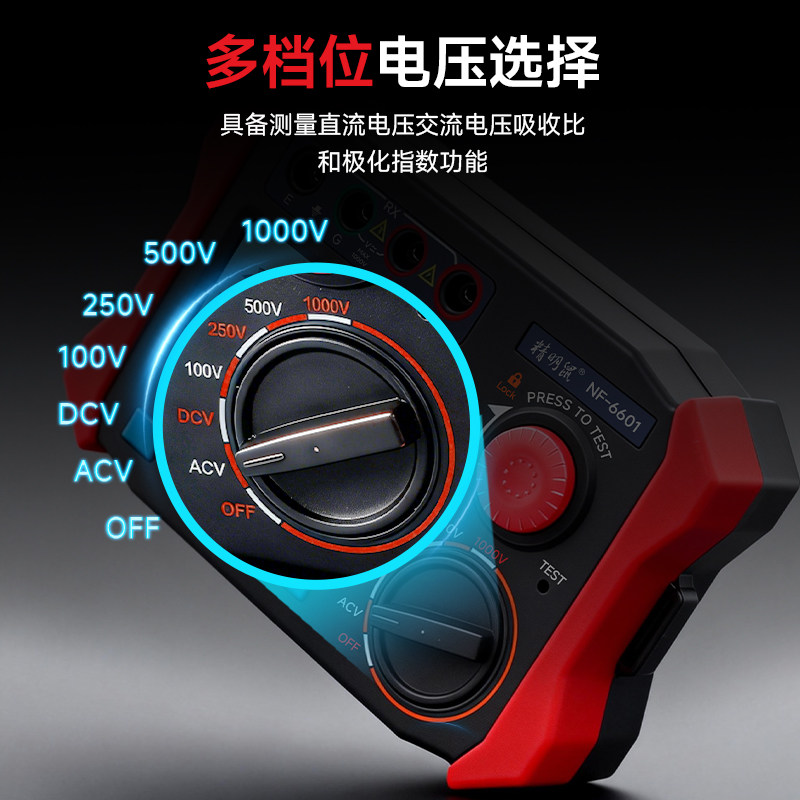 精明鼠NF-6601兆欧表是一款专业级绝缘电阻测试仪,适用于电力、通信、建筑等领域的电气设备绝缘性能检测。该仪表具备1000V测试电压,可精准测量高达10000MΩ的绝缘电阻,满足多种高标准测试需求。采用高精度电子数字显示,读数清晰直观,避免传统指针式摇表的人为误差。内置智能保护电路,具备自动放电、短路报警等功能,确保操作安全。体积小巧、携带方便,支持手动/自动量程切换,响应迅速,测试稳定。广泛应用于电机、电缆、变压器及配电系统的维护与检修,是电工和工程技术人员的可靠工具。