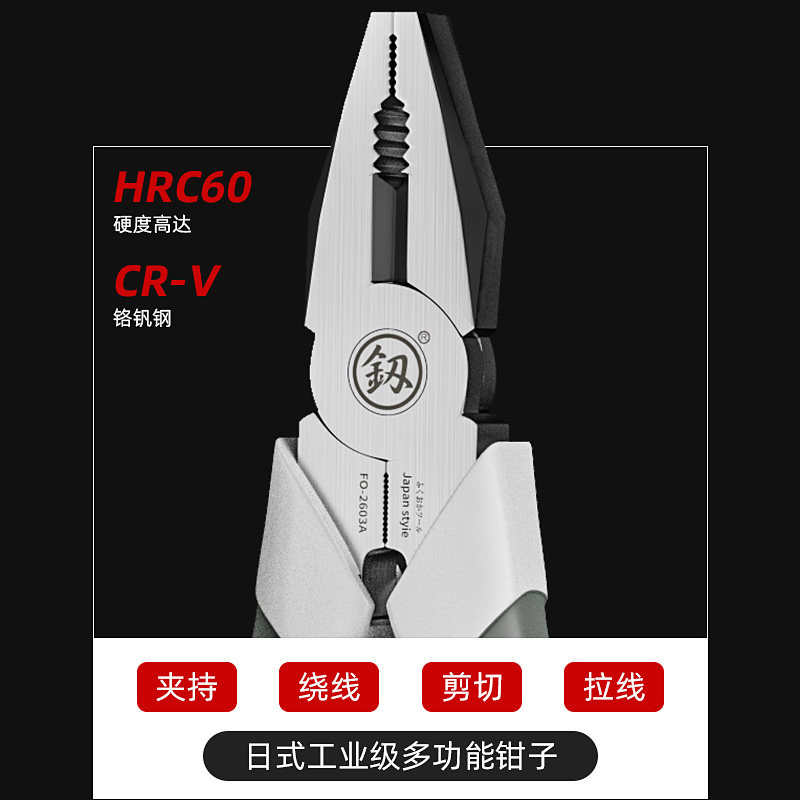 福冈老虎钳工业级钳子系列专为电工及专业维修人员设计,涵盖万用钢丝钳、尖嘴钳、电工钳等多款工具,具备高强度铬钒钢锻造、精密热处理工艺,确保耐用性与抗腐蚀性。钳口锋利,咬合力强,可轻松剪切钢丝、铜铝线及细小零件;防滑绝缘手柄符合人体工学,提供舒适握感与安全保护,适用于高低压作业环境。产品精度高、操作灵活,广泛应用于电力安装、设备维修、电子制造等领域。福冈老虎钳以卓越品质与可靠性,成为专业技工信赖的高效工具之选,是电工工具箱中不可或缺的全能装备。