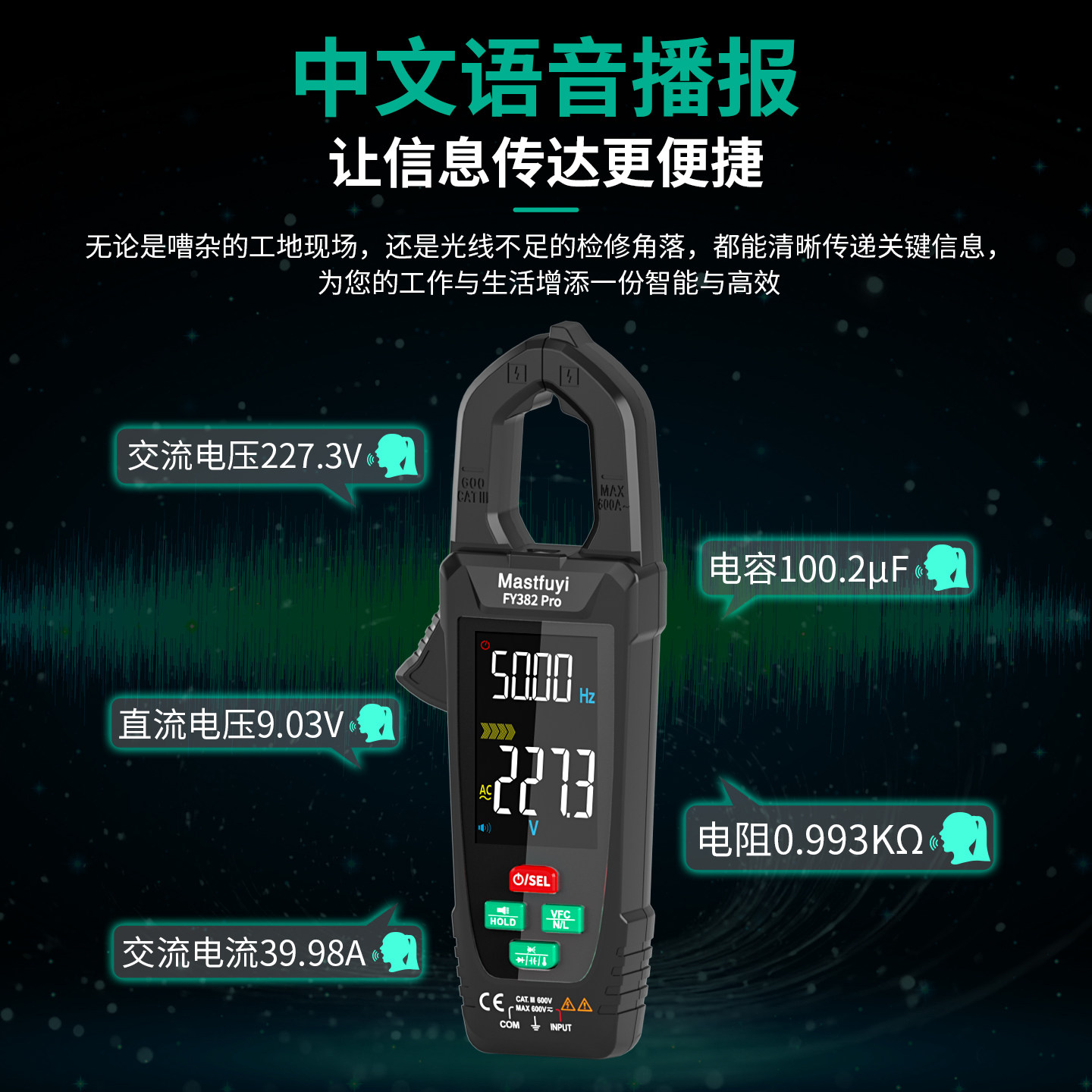 福仪语音数字钳形表是一款集多功能于一体的高精度电工测量工具,具备全自动量程切换功能,操作简便高效。它融合了钳形电流表与数字万用表的优势,可非接触式测量交流/直流电流,同时支持电压、电阻、电容、频率及通断测试等多种功能。配备高清背光液晶屏和语音播报功能,即使在嘈杂或光线不足环境中也能清晰读数。内置可充电锂电池,续航持久,使用便捷。高精度传感器确保测量数据准确可靠,广泛应用于电力、通信、家电维修等领域,是专业电工和工程技术人员的理想选择。