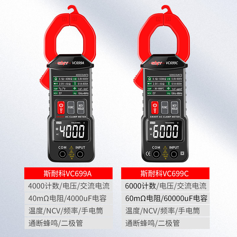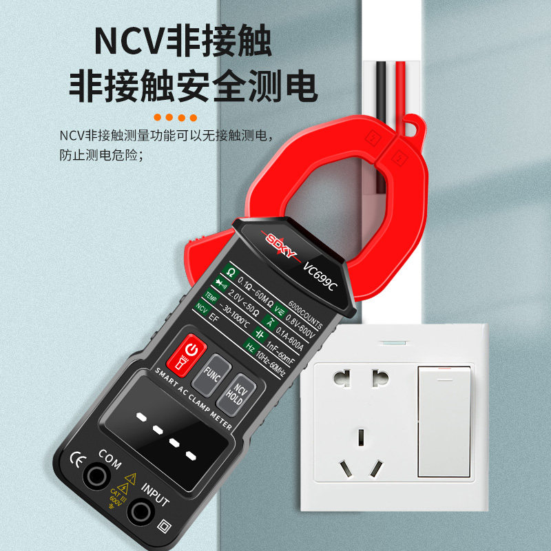 斯耐科全自动数显钳形万用表是一款集多功能于一体的便携式数字万能表,采用先进的钳形非接触式电流检测技术,可安全便捷地测量交流/直流电压、电流、电阻、电容、频率及通断性。其最大亮点是支持大电容测量,量程高达20mF,适用于电机、电源等设备的维护检测。配备高清LCD数显屏,自动量程切换,操作简便,响应迅速。迷你机身设计,轻巧便携,适合电工、维修人员及电子爱好者日常使用。具备数据保持、背光显示和低电量提示等实用功能,兼顾安全性与精准度,是工业检测与家庭用电排查的理想工具。