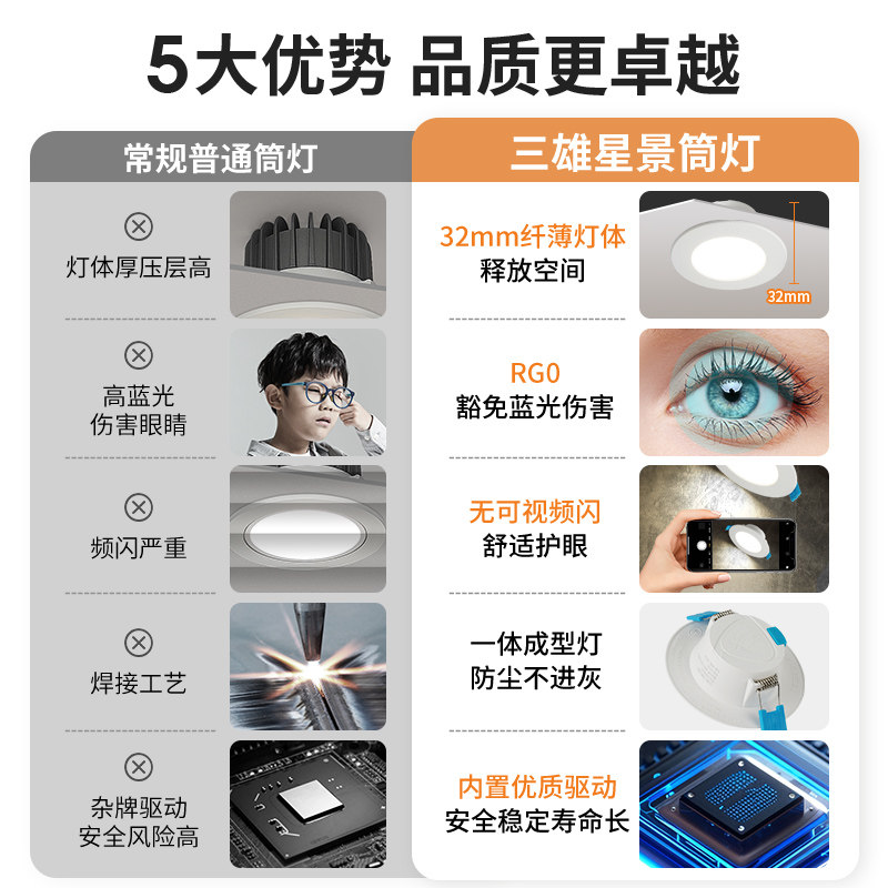 天猫三雄极光led筒灯洗墙嵌入式超薄客厅走廊过道灯防眩