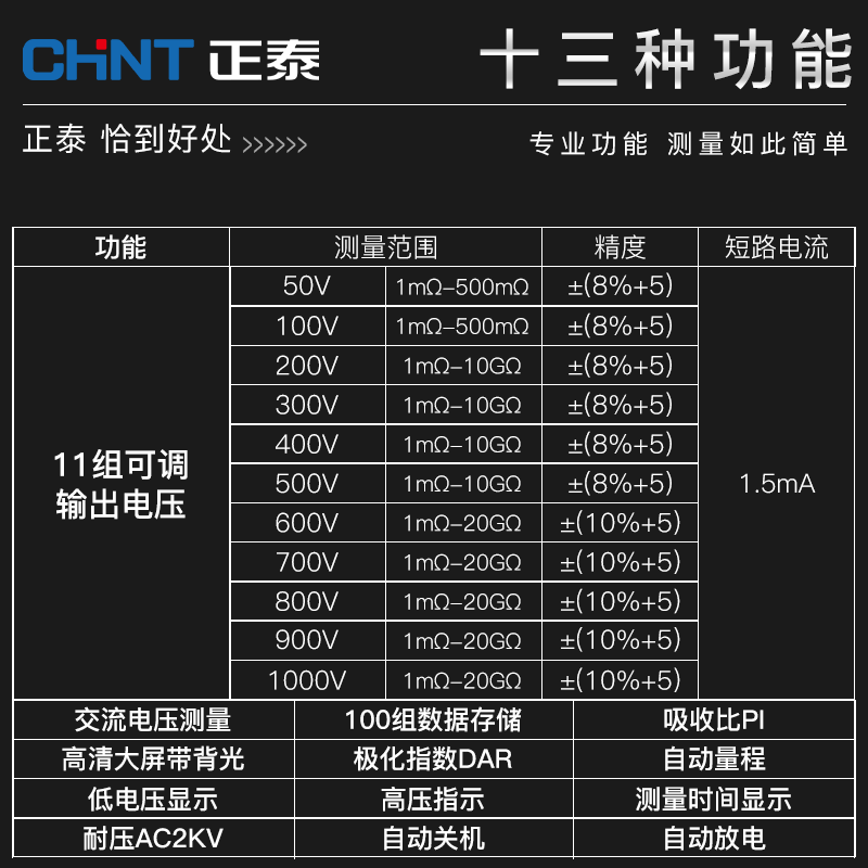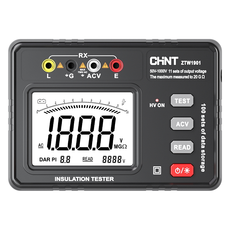 正泰绝缘电阻测试仪(数字摇表)是一款高精度电子式绝缘电阻表,适用于500V测试电压,量程可达1000MΩ,广泛应用于电力设备、电缆、电机及电气线路的绝缘性能检测。该仪表采用数字显示技术,读数清晰直观,具备自动量程切换、低电压提示和背光功能,操作简便可靠。相比传统手摇式兆欧表,正泰数字摇表无需手摇发电,测试更稳定、效率更高,且具备数据保持与自动放电功能,有效保障测试安全。其结构紧凑、携带方便,符合国际安全标准,是电力维护、工程施工及电气设备检修中的理想检测工具,确保电气系统安全运行。