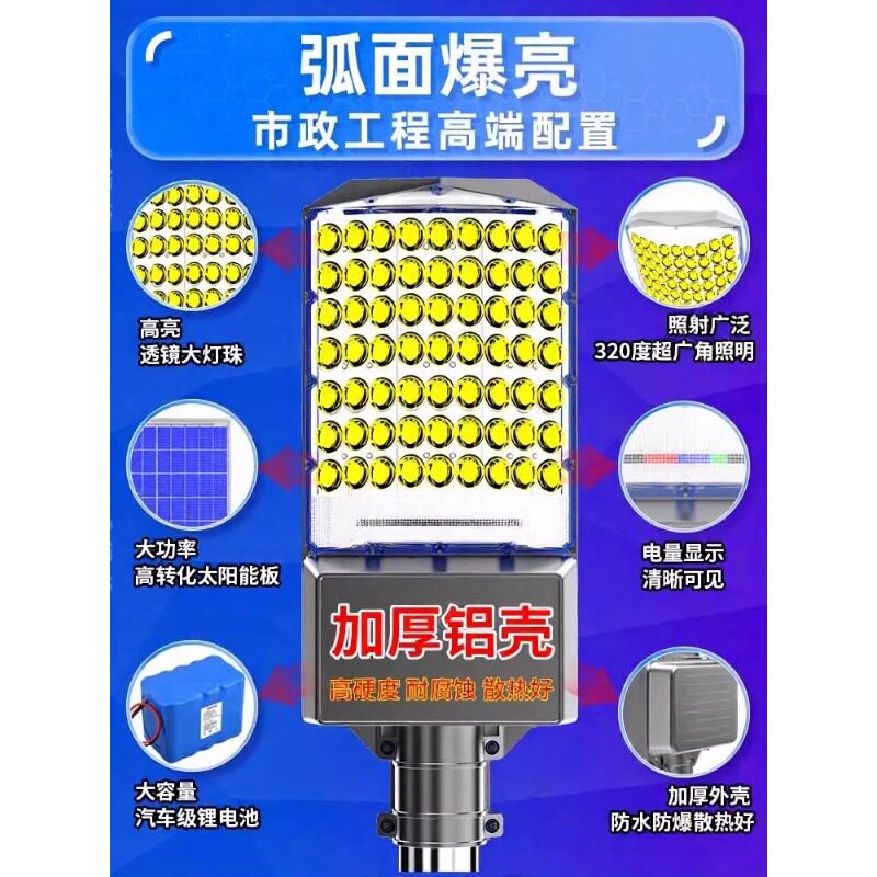 2026年新款太阳能户外庭院灯,专为家用及农村照明设计,集高效、节能与强光于一体。采用新一代单晶硅太阳能板,光电转换效率高达23%,搭配大容量磷酸铁锂电池,阴雨天气可持续亮灯5-7晚。配备20W大功率LED灯珠,亮度可达2000流明,照射范围广,夜间如白昼,有效提升庭院、门口、道路安全性。IP65防水防尘等级,适应各种恶劣天气。智能光控+人体感应双模式,天黑自动亮灯,人来增亮,人走微亮,节能又智能。安装简便,无需布线,节能环保,是新农村建设和家庭户外照明的理想之选。