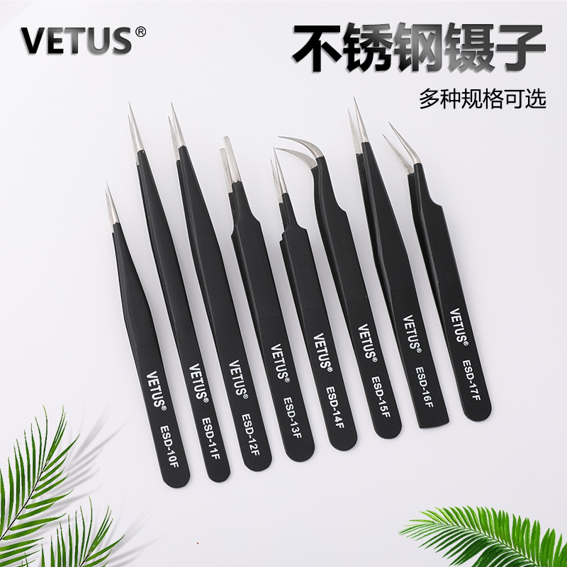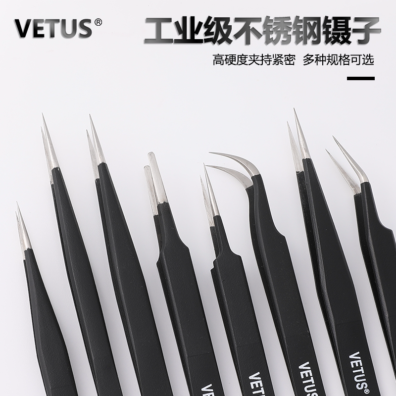 VETUS镊子燕窝拔毛不锈钢去黑头精密尖头弯头美容美甲镊子夹套装