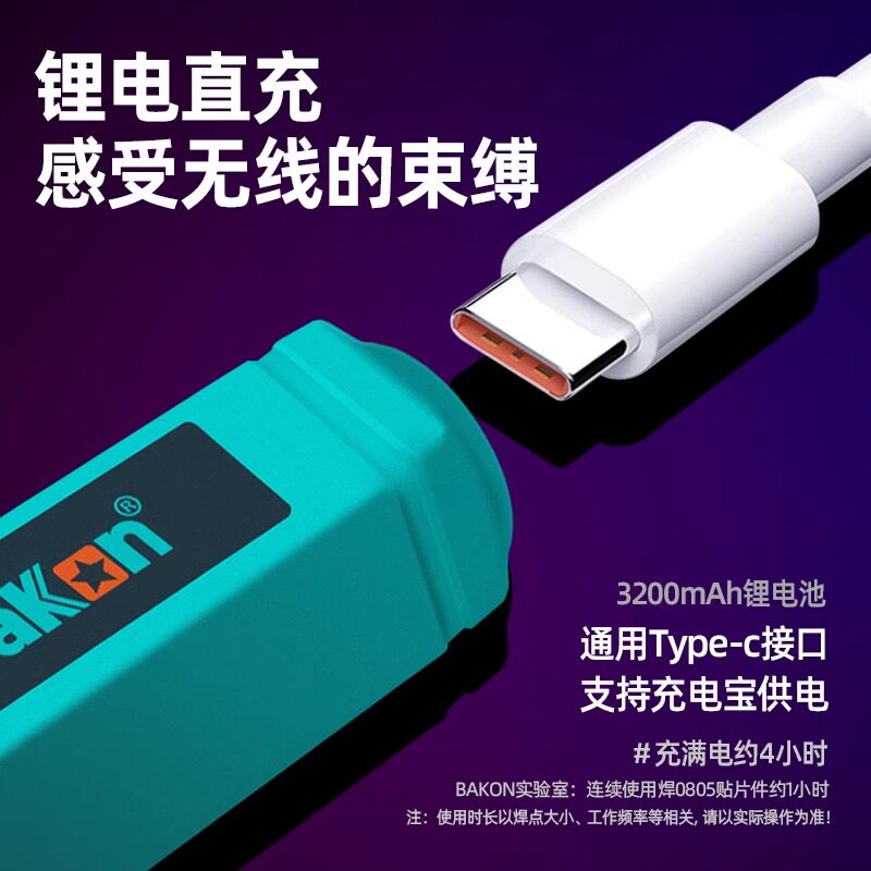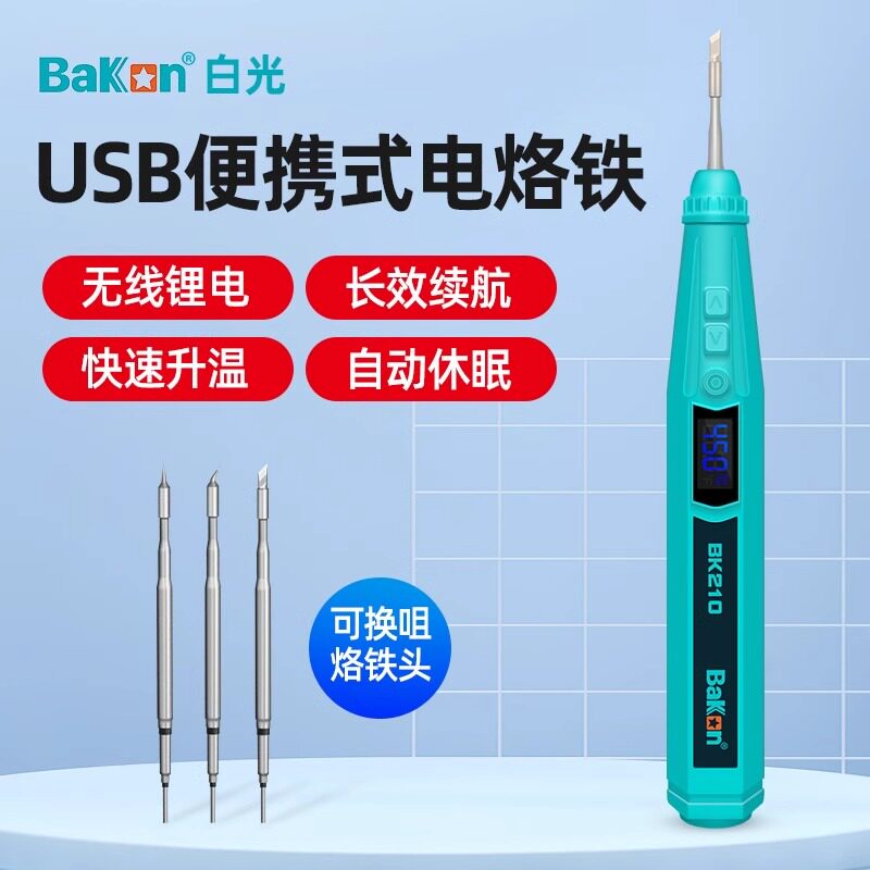白光BK210是一款USB充电式迷你便携式电烙铁,专为家用及DIY爱好者设计。采用先进陶瓷发热技术,升温迅速,控温稳定,安全高效。小巧轻便,握感舒适,支持Type-C充电,续航持久,摆脱传统电源线束缚,随时随地轻松焊接。套装包含烙铁头、焊锡丝、清洁海绵等常用配件,满足电子元器件、电路板、首饰维修等多种场景需求。具备过热保护与自动休眠功能,使用更安全。白光BK210集便携、高效、安全于一体,是家庭维修、创客制作和初学者的理想之选,让焊接工作更轻松便捷。