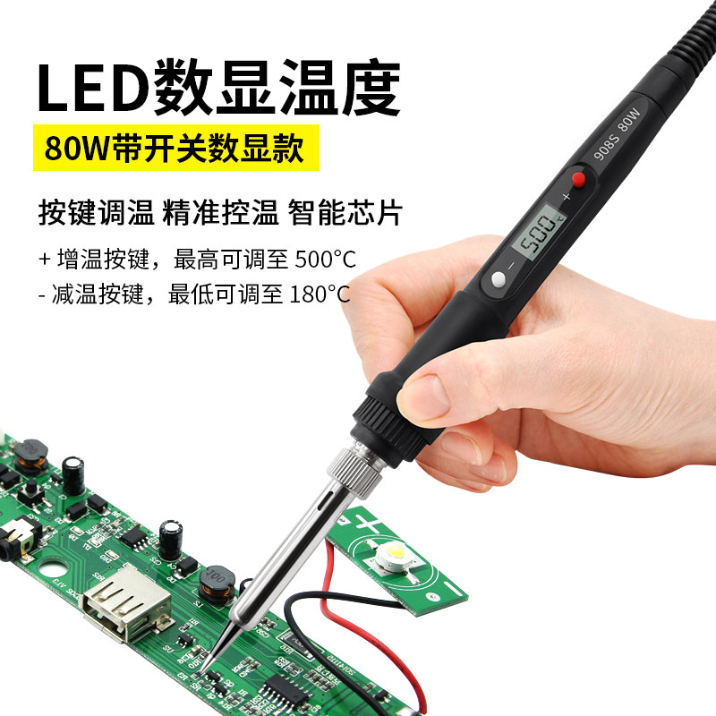 80W数显908S电烙铁是一款家用内热式恒温焊接工具,采用高效发热芯,升温迅速,控温精准。配备数字显示屏,可实时查看温度,支持300℃~480℃无级调温,满足不同焊锡需求。内热式结构设计,热效率高、寿命长,手柄符合人体工学,握感舒适,操作安全。适用于电子维修、DIY制作、电路板焊接等场景。配备优质焊台,稳固防滑,内置烙铁架与海绵,方便清洁与收纳。具备过热保护功能,使用更安全。整体小巧便携,是家庭和电子爱好者理想的焊接工具,兼顾性能与实用性。