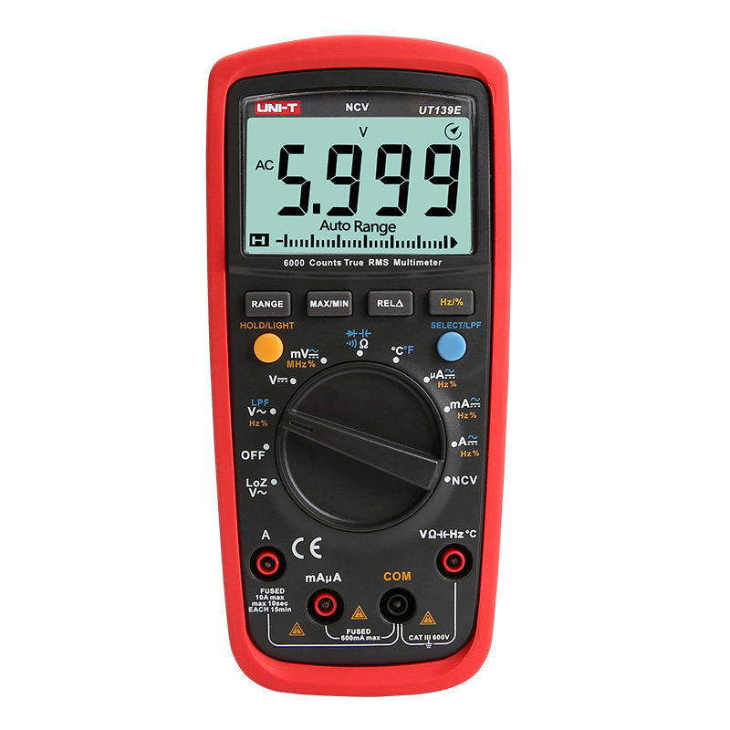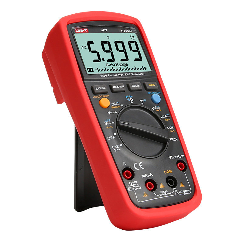 优利德UT139系列(UT139A/B/C/E)数字万用表是一款具备全保护防烧功能的高性能数显多用表,适用于电子维修、工业检测及电气维护等领域。该系列采用先进的自动量程与手动量程设计,支持电压、电流、电阻、电容、频率、温度及二极管测试等多种功能,测量精度高、响应迅速。其核心亮点在于全保护电路设计,有效防止误操作导致的仪表烧毁,显著提升安全性和耐用性。配备大屏背光LCD显示,支持数据保持与相对值测量,操作便捷。UT139系列结构坚固,符合CAT III安全标准,是专业工程师和电子技术人员的可靠工具。