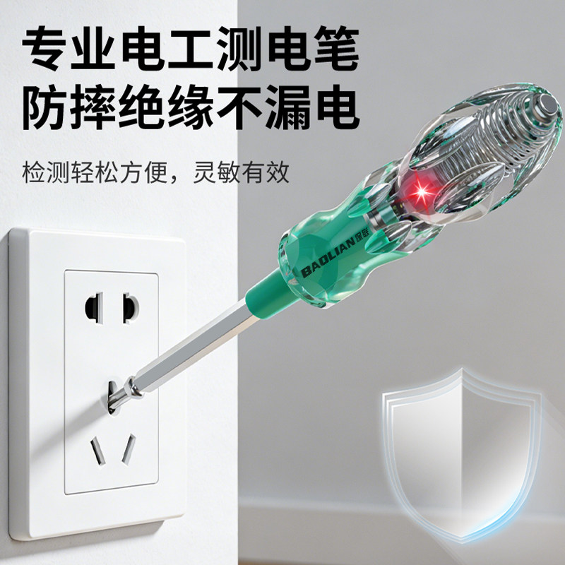 高扭力电笔电工专用测断线防摔耐用多功能检测验电两用批头螺丝刀,集验电、测断线、螺丝刀功能于一体,专为电工日常作业设计。采用高强度合金钢批头,具备高扭力输出,轻松应对各类紧固与拆卸任务。内置灵敏验电模块,可快速检测线路是否带电,并支持断线查找,提升检修效率。整体结构坚固,防摔抗震,适应复杂施工环境。绝缘手柄符合安全标准,握感舒适,防滑耐用。一物多用,兼具实用性与安全性,是专业电工的理想工具,广泛应用于家庭维修、工业安装及电力维护等场景,显著提升工作效率与操作安全。