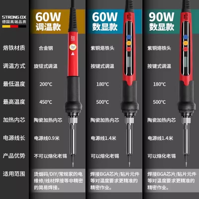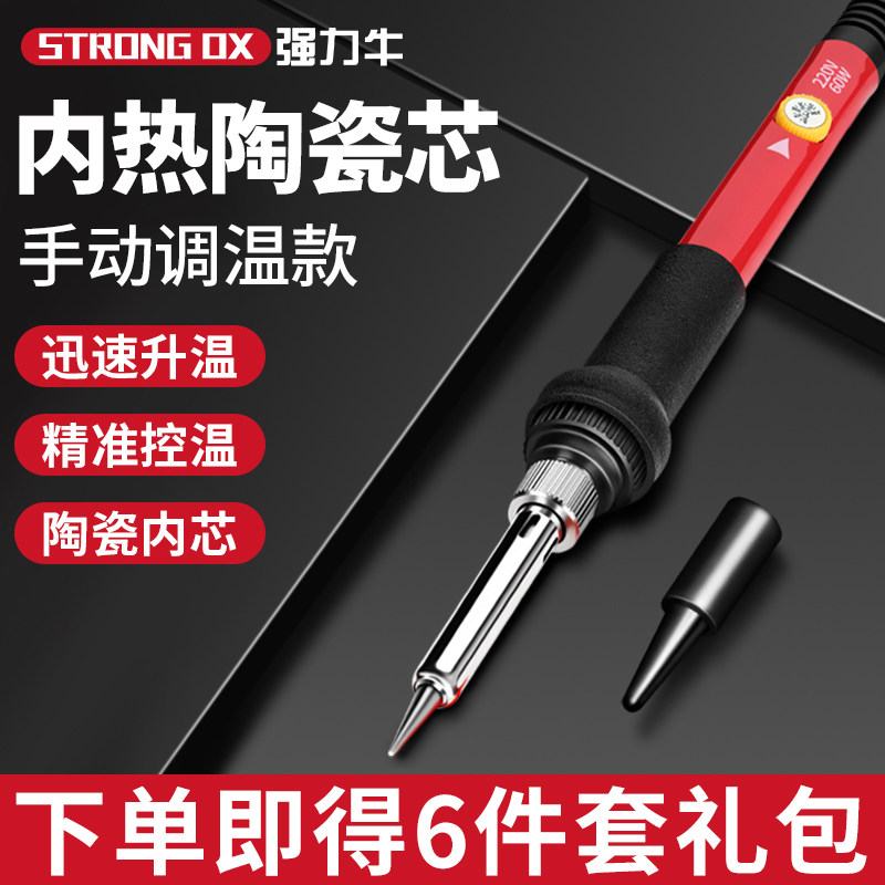 强力牛电烙铁专业级家用大功率维修焊接套装,采用先进内热式加热技术,升温迅速、热效率高,控温精准,确保焊接稳定可靠。配备大功率发热芯,适用于电子元件、家电维修、电路板焊接等多种场景。套装包含多种烙铁头及辅助工具,满足不同焊接需求。手柄符合人体工学设计,握感舒适,长时间使用不易疲劳。安全可靠,具备防静电与过热保护功能,适合家庭DIY爱好者及专业维修人员使用。无论是精密焊接还是高强度作业,强力牛电烙铁套装都能高效胜任,是维修与创作的得力助手。