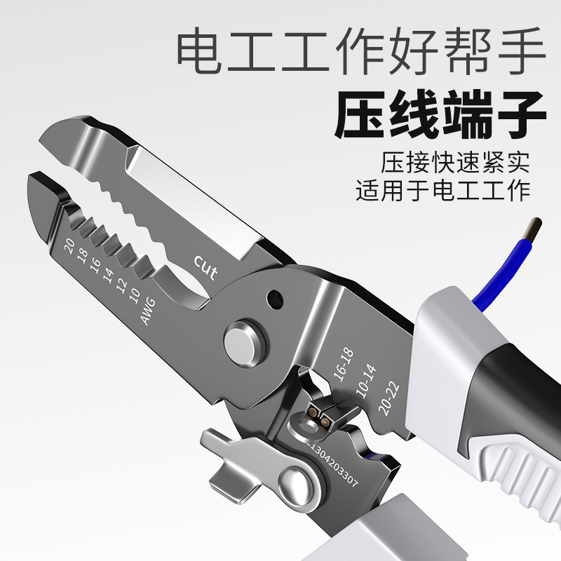 剥线钳是一款专为电工设计的多功能工具,集剥线、剪线、压接、分线于一体,适用于各类电缆、电线的快速处理。其精密刀口可精准剥除不同规格的绝缘外皮,避免损伤内部导体,提升作业安全与效率。钳身采用高强度合金钢制造,耐用防锈,手柄符合人体工学设计,握感舒适,长时间使用不易疲劳。部分型号还配备压线端子功能,满足接线需求。无论是家庭电路维修、电气设备安装,还是通信工程布线,剥线钳都是不可或缺的专业工具,被誉为电工手中的“神器”,真正实现一钳多用,省时省力。
