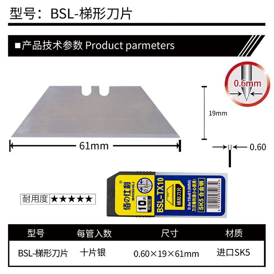 佰仕利重型梯形刀片折叠美工刀是一款专为高强度作业设计的实用工具,采用加厚T型不锈钢结构,坚固耐用,抗腐蚀性强。其梯形刀片锋利持久,适用于切割纸箱、塑料、绳索等多种材料,广泛用于电工、仓储、包装等场景。刀身折叠设计安全便捷,携带方便,锁扣稳固,使用时更安心。加厚刀柄符合人体工学,握感舒适,防滑耐磨,长时间作业不易疲劳。无论是开箱、裁剪还是日常维修,这款美工刀都能高效应对,是专业工匠和DIY爱好者的理想选择,兼具安全性与实用性,值得信赖。