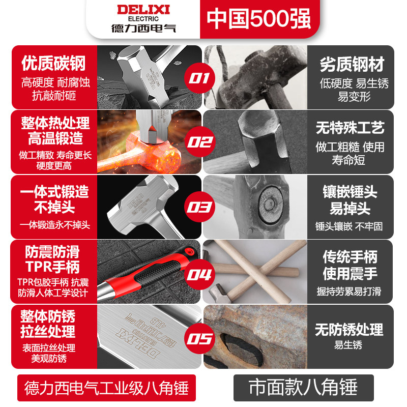 天猫德力西电气锤子八角锤榔头工具砸墙大锤二锤手锤超硬大铁锤石工锤