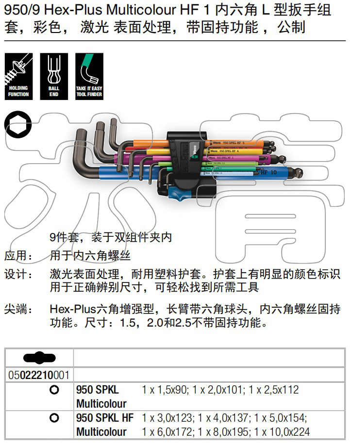 淘宝德国维拉Wera带定位球公制彩色内六角扳手9件套950SPKL/9HF 固持