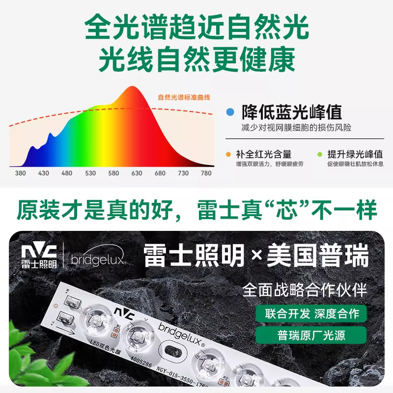 【直播专享】雷士照明未来光全光谱护眼吸顶灯,专为客厅、卧室打造,融合科技与美学。采用全光谱LED技术,光线接近自然日光,有效减少蓝光危害,呵护家人视力健康。超薄设计,厚度仅2.8cm,简约百搭,轻松融入现代家居。高亮节能,光效高达100lm/W,明亮不刺眼,营造舒适光环境。支持三档调色温(3000K-5700K),满足不同场景需求。直播专享价,性价比超高,更有安装服务与质保承诺,让您买得放心、用得安心。雷士照明,用光守护家的每一刻美好。