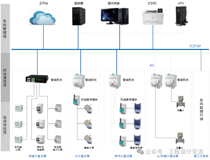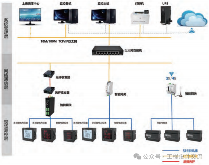(四)适用场景 重点适配制造业工厂、商业综合体、产业园区、大型公共建筑等需要多能源协同管控的场景,尤其适合能耗品类多、计量节点分散、有明确节能目标的企业。 二、电力监控系统 (一)核心定位与价值 电力监控系统功能主要有:系统运行监视、数据报表系统、远程控制和系统参数设置、重要路负荷趋势分析、图形化分析事件记录和查询、支持越限报警设置、谐波监测、支持BS网络结构和系统互联等。电力监控系统聚焦供配电系统全流程管控,通过整合成熟的仪器仪表、计算机与通信技术,实现数据采集、状态监测、故障报警、数据存储及远程控制等功能。其核心价值在于提升供配电系统的安全性、可靠性与稳定性,降低故障停机风险,适配复杂供配电网络的精细化管理需求。 (二)系统架构详解 同样采用“三层架构”,核心聚焦电力数据的采集与管控,架构设计侧重实时性与可控性: