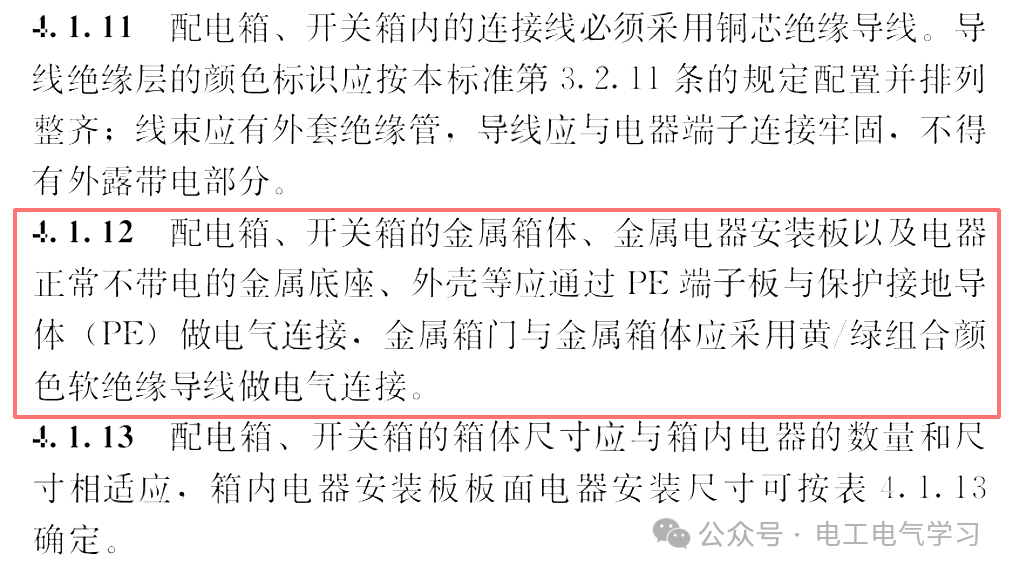 也正因为这个原因,新版规范JGJ46-2024《建筑与市政工程施工现场临时用电安全技术标准》,直接废止了编织软铜线的使用要求。 新版规范4.1.12条明确规定,箱门跨接不再允许用编织软铜线,转而要求采用黄绿组合绝缘导线,从根源上解决腐蚀、断裂带来的安全问题。 除了这份新版临时用电规范,GB 50303-2015《建筑电气工程施工质量验收规范》也有明确要求,而且更细致。