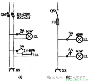 简单明了的图,也可以不加文字符号,直接用型号标注。上图(b)是单相单线接线图,装了两个电灯和1只插座,两个开关分别是壁开关和拉线开关,画法简洁,一眼就能看清连接关系。 |