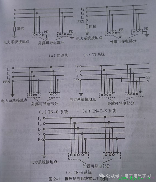 很多电工刚入行,一提到配电系统就发懵:TT、IT、TN-C、TN-S,光听名字就晕,更别说区分用法了。工地、小区、厂房、家用的配电形式完全不一样,一旦接错线,轻则频繁跳闸、影响使用,重则引发安全事故,危及人身和设备安全。今天一次性讲透,配电系统到底分哪几类、用在什么地方、怎么一眼识别,全是干货,建议电工同行先收藏再看,避免后续踩坑。 一、按电压等级 配电系统最基础的分类,就是按电压分,新手先记牢这两类,不会出错。 1.高压配电系统:电压等级在1kV以上,平时最常见的是10kV、35kV,主要用在变电站、厂区主供电、大型设备进线。特点很明显,电压高、电流小、传输距离远,核心提醒:必须持证操作,新手千万别碰。 2.低压配电系统:就是我们日常接触最多的220V/380V,家庭、商铺、车间、写字楼、工地,基本都用这个。应用最广,也是我们平时接线、维修打交道最多的系统,新手重点掌握这类就够日常作业。 二、按接地形式 这部分是考试、施工、验收的核心,很多老师傅都容易混淆,新手一定要吃透,避免接错线。 1. IT系统 电源中性点不接地,或者高阻抗接地,设备的金属外壳要单独接地。它最大的优点是,发生第一次单相接地时,不会跳闸、不会断电,供电连续性极强。 适用场景也很明确:医院手术室、煤矿、钢厂、数据中心这些不允许随便停电的场所,优先用IT系统。 2. TT系统 电源中性点直接接地,设备外壳要单独做接地极,和电源零线没有关联。优点是安全性高,相互干扰小;但缺点也明显,故障电流小,必须装漏电保护器才能正常跳闸。 平时农村电网、老旧小区、户外路灯,还有工地临时用电,大多用的是TT系统。 3. TN系统(目前最主流)