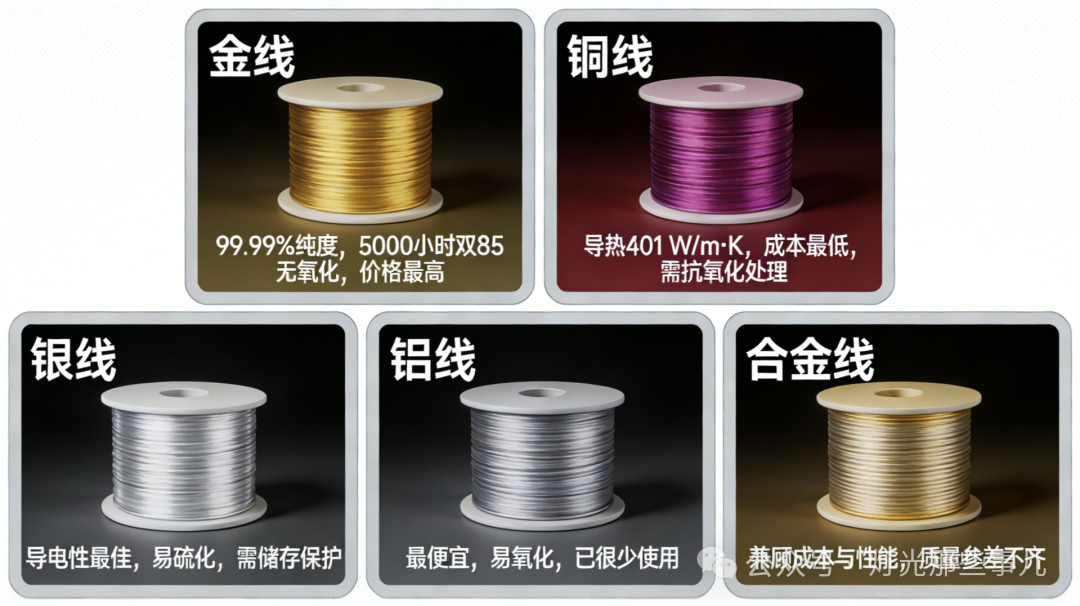 键合线的主流材质有五种,它们在性能、成本、可靠性上差距很大。 1. 金线(Au)——可靠性之王,但贵 金线是目前最稳定、最可靠的键合线材质。金线的纯度必须达到99.99% 以上,才能满足LED封装的严格要求。它最大的优点是化学稳定性极好,几乎不氧化、不腐蚀。 在高温高湿测试中,纯金线的抗氧化和抗腐蚀能力远优于合金线,可靠性更高。同时,金线具有良好的反光特性,有利于提高光效。 缺点:价格昂贵,是铜线的10倍甚至更高。适合高端、高可靠性项目,如汽车大灯、医疗设备、户外大屏等。 2. 铜线(Cu)——导热好、便宜,但怕氧化 铜线的导热系数达401 W/m·K,比金线高出26%,散热能力更强。价格仅为金线的1/3到1/10,成本优势巨大。 缺点:铜线容易被氧化,在潮湿环境下会生锈,导致电阻升高、焊点断裂。现代铜线工艺已有所改进,如镀钯铜线和氮化钛表面处理可使抗氧化能力提升300%,焊接良率从92%提升至99.6%。但在高湿、盐雾等恶劣环境下,铜线仍不如金线可靠。 3. 银线(Ag)——导电性最好,但怕硫化 银的导电性比金好,是导电性最好的常见金属。价格介于金线和铜线之间。储存期可达6-12个月,不需要密封处理。 缺点:银容易硫化,在潮湿、污染环境中会发黑,导致接触不良。拉力不如金线。打线时拉力较弱,对键合工艺要求高。 4. 铝线(Al)——最便宜,但基本被淘汰 铝线价格最低,密度小、重量轻,适合一些低端或特殊应用。但铝线易氧化、硬度低、键合工艺不稳定,可靠性较差,目前已很少使用。 5. 合金线——性价比方案,但良莠不齐 合金线是近年来为了降低成本而出现的替代方案。常见的有银合金线(主要成分是单晶银,含量90%-99%)和金包银合金线。价格比金线低,比铜线高。与镀银支架焊接时,可焊性较好。 但合金线的可靠性参差不齐,不同厂商的产品质量差异很大。合金线容易受到硫/氯/溴化腐蚀,长期可靠性不如纯金线。有些合金线在高温高湿环境下,焊点会提前老化断裂。 二、怎么选?看场景,算成本