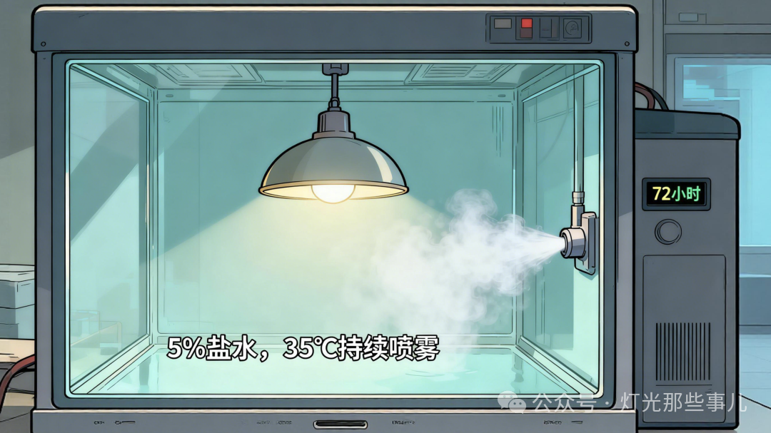 盐雾测试,就是把灯具放进一个封闭的试验箱里,用5%浓度的盐水(和海水差不多)持续喷雾,温度控制在35°C左右,模拟海洋环境的腐蚀过程。 灯具在里面“泡”着盐雾,少则24小时,多则几百小时。测试结束后拿出来看:外壳有没有起泡?金属件有没有锈?灯还能不能亮? 这项测试依据的国家标准是GB/T 2423.17,2025年3月1日起已经执行新版(GB/T 2423.17-2024)。所以问供应商要报告时,记得看是不是新版的。 二、盐雾测试多少小时算及格?
