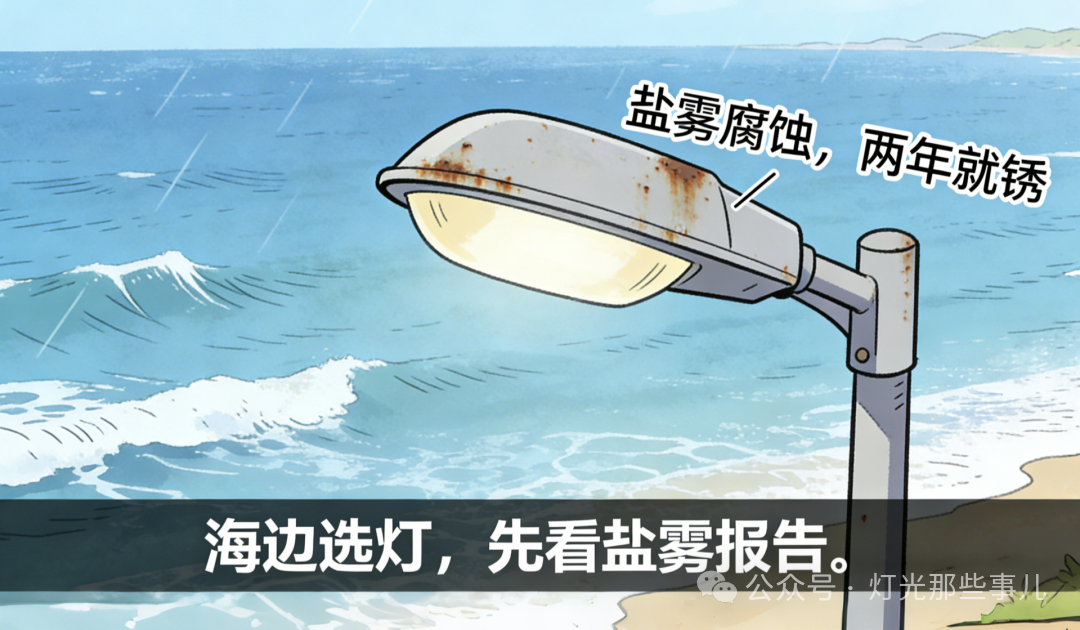 你有没有见过这种灯:装在海边不到两年,外壳锈迹斑斑,螺丝拧不下来,灯罩发黄,驱动进水。明明标的是户外灯,怎么就不扛造? 问题出在盐雾上。海风里裹着盐分,比普通雨水腐蚀性强几十倍。普通灯具扛不住,两三年就废了。今天聊聊“盐雾测试”——海边项目选灯,必须看这个报告。 一、盐雾测试是什么?怎么做的?