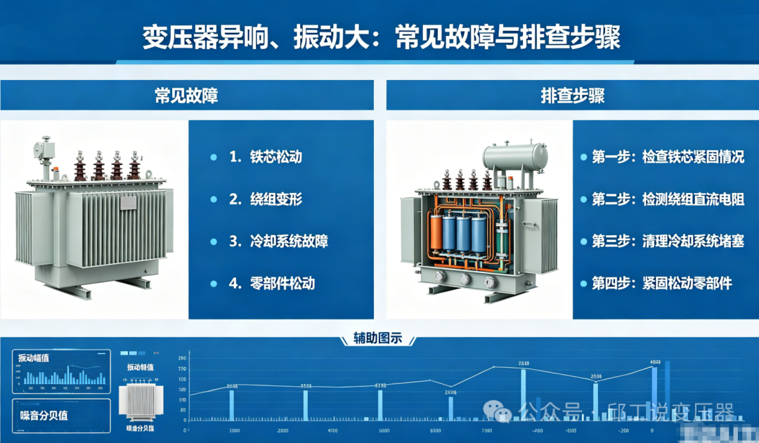 排查核心原则:先安全、后排查,先外部、后内部,先易后难,杜绝带电操作内部部件,避免安全事故和设备二次损坏。 1. 确认变压器负荷稳定,无过载、过压情况,做好停电预案(如需拆检,必须彻底停电、放电,悬挂“禁止合闸”标识); 2. 准备基础工具:听音棒(绝缘款)、红外测温仪、扳手、振动测试仪(进阶可选),佩戴绝缘手套、护目镜。 |