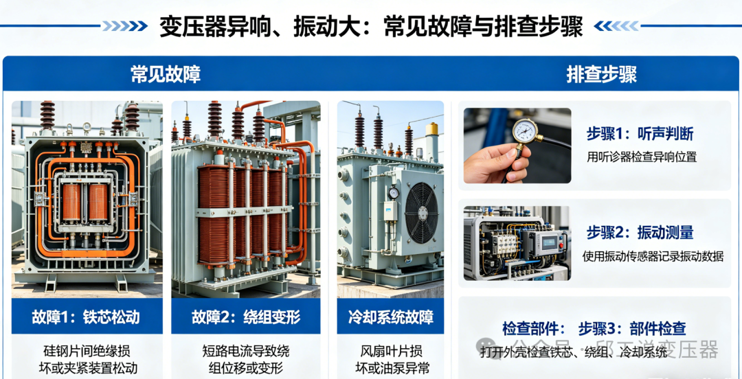 本文精简专业要点,避开复杂术语,教你快速识别常见故障、掌握标准化排查步骤,运维人员可直接参考落地。 异响和振动的类型,直接对应不同故障,无需复杂仪器,通过“听+看”就能初步判断: 异响特征:“嗡嗡”声明显增大、音调忽高忽低,振动同步加剧,无金属撞击声;严重时伴随油温轻微升高。 核心原因:铁芯硅钢片夹紧力不足(低于设计值15%时,噪声会骤增8-12dB)、硅钢片绝缘老化,导致磁致伸缩失控;或非线性负载产生的谐波电流,激发绕组共振,谐波畸变率超标时,振动加速度会升至正常值3倍以上。 异响特征:“咔嗒咔嗒”金属撞击声、“滋滋”摩擦声,振动不规则,轻敲变压器外壳时异响会变化。 核心原因:固定螺栓、铁芯夹件松动(预紧力逐年衰减,低于初始值60%会引发宽频撞击噪声);分接开关触头接触不良、传动机构卡滞;绕组变形或位移,运行时产生机械摩擦。 异响特征:“嗡嗡”声基础上叠加风扇、油泵的异常噪音,或冷却系统突然无声,但振动仍存在。 核心原因:冷却风扇轴承磨损、叶片变形;油泵气蚀、堵塞;温控器故障导致冷却系统未正常启动,设备散热不良引发振动加剧。 异响特征:异响随环境变化(如邻近交通振动、风速变化),振动多集中在底座部位。 核心原因:地基不平、底座固定不牢,或邻近公路、铁路的振动传递至变压器本体;封闭式环境中空气声反射叠加,放大噪声和振动。