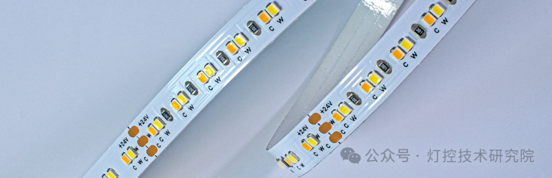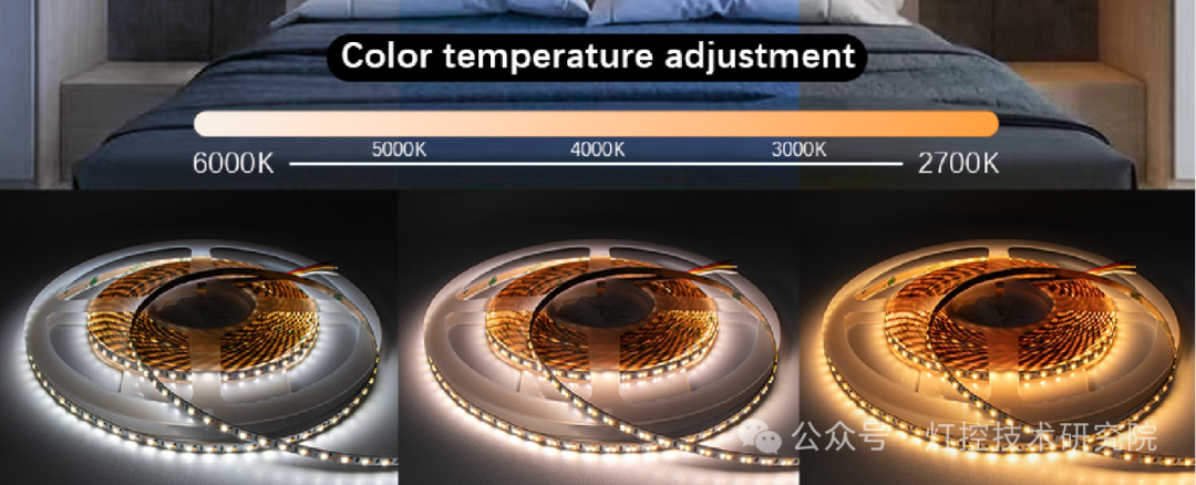 LED双色温灯带是一种结合暖白光(2700K-3000K)和冷白光(6000K-6500K)两种色温LED芯片的照明产品。通过独立调节两路LED的亮度比例,实现色温在2700K至6500K范围内连续变化。 其技术实现主要分两类: 1.双路独立LED组合:暖白与冷白LED交替排列,通过控制器分别调节两路电流,混合生成目标色温。