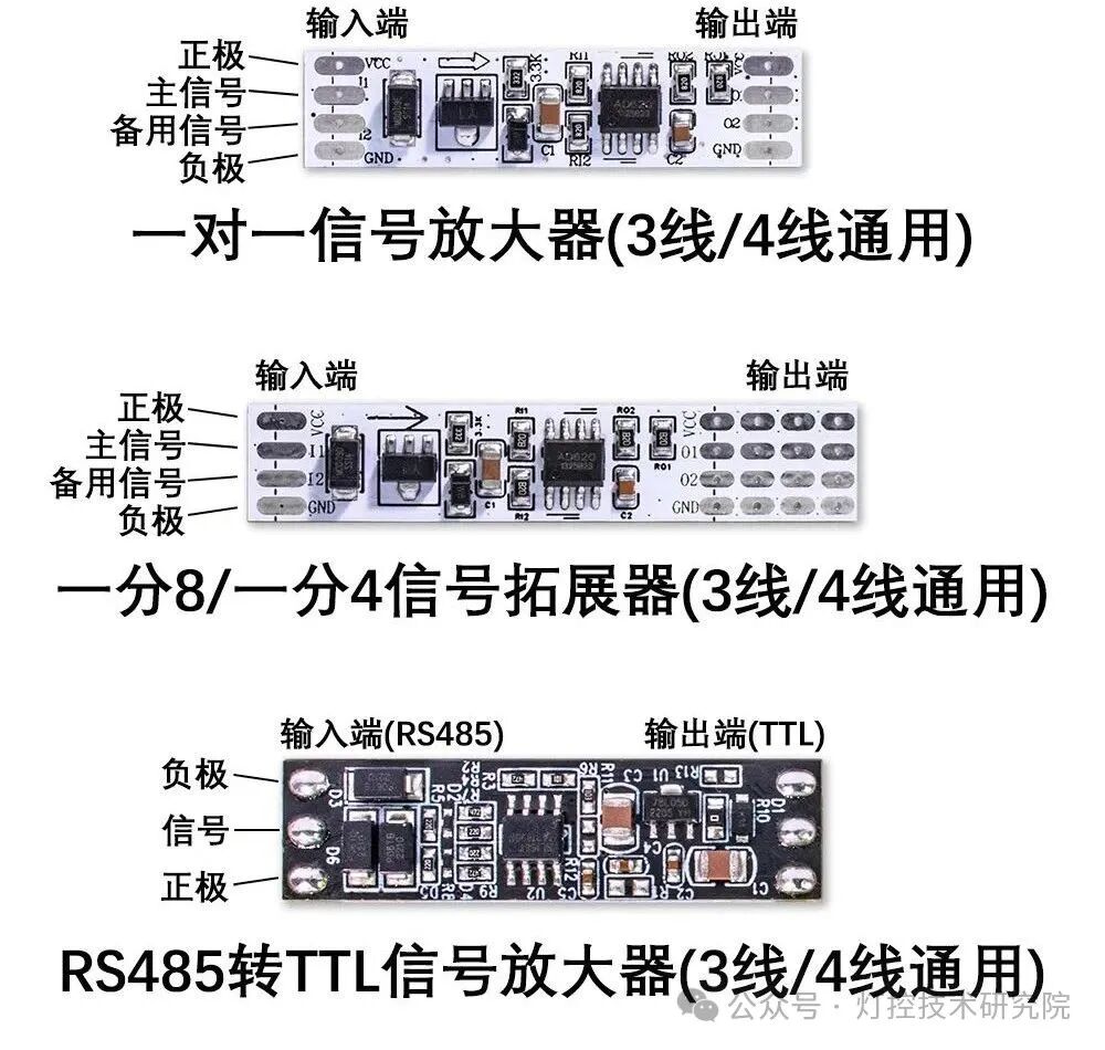 3.信号干扰与衰减: 1.控制器到灯带的信号线过长,常规控制器到灯带的信号线长度要控制在15米内。出现这种情况可以加RS485转TTL信号放大器。 2.两条灯带之间的信号线过长,常规灯带到灯带的信号线长度要控制在8米内。 出现这种情况可以每间隔推荐距离加装信号放大器,分段控制,使用多个控制器
