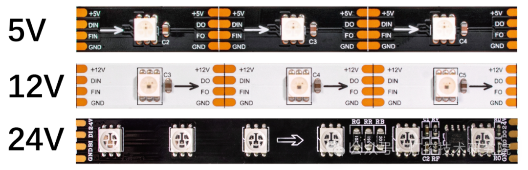 电压:DC 5V/12V/24V(5V压降过大适合使用量少的项目,12V一般是5米无压降适合中大型项目,24V更适长距离、大功率项目)。