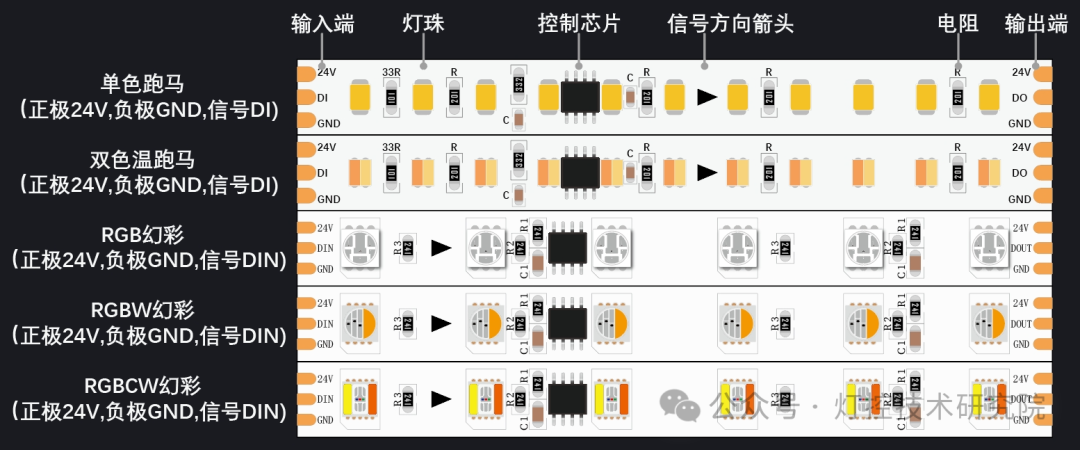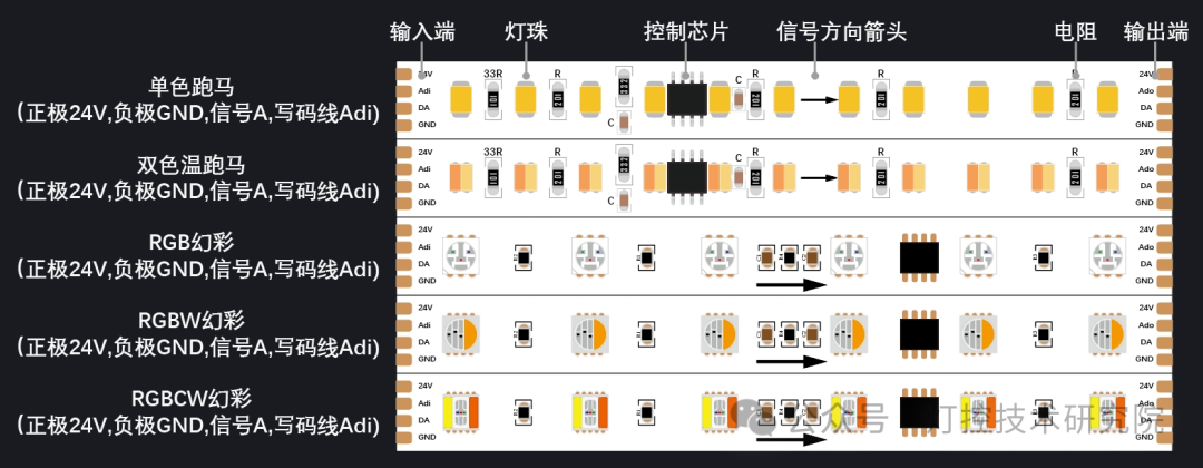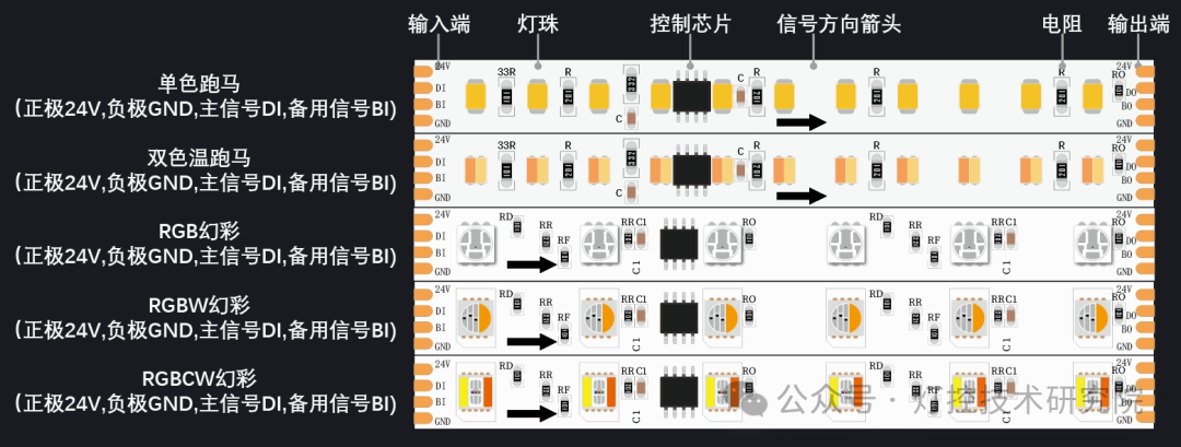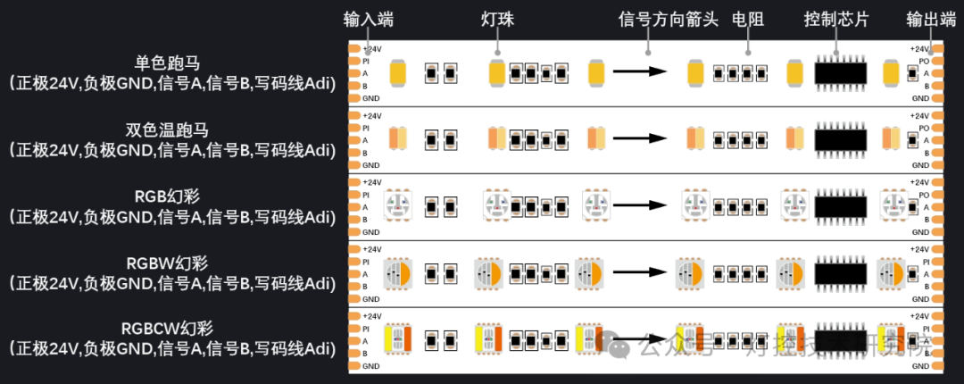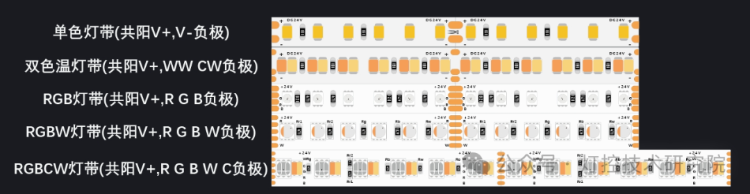 低压灯带的5种:单色/双色温/RGB/RGBW/RGBCW五种。