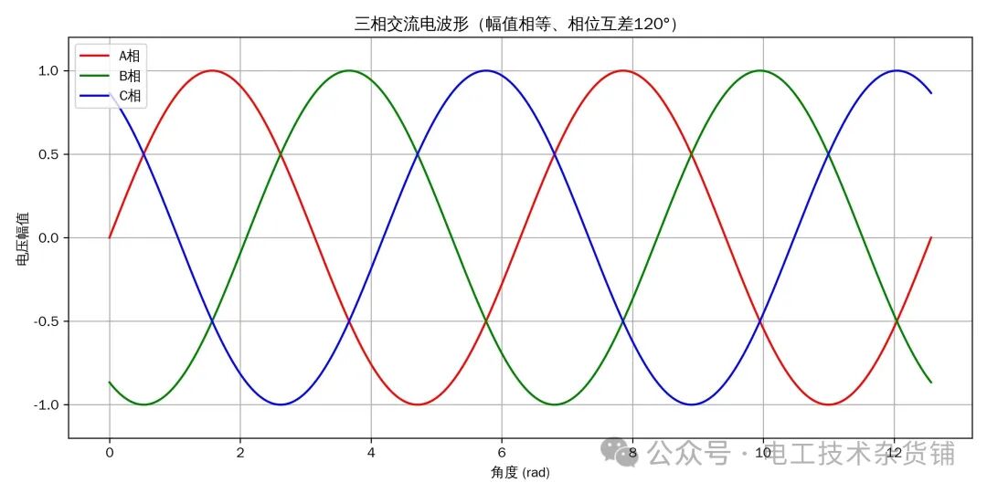 干电工的天天和三相电打交道,接电机、配配电柜、看设备铭牌都离不开它,吃透三相电特点和功率相关概念,现场干活才不慌。今天用大白话讲清这些实用基础,没有复杂公式,全是一眼能懂的干货。 三相交流电,就是三组交流电组合供电,核心就三个关键特点:幅值相等、频率相同、相位互差120°。咱们国内工频都是50Hz,三根火线的电压峰值完全一样,相位上依次差120°,这是三相电的根本,也是它比单相电更适合工业用电的关键。